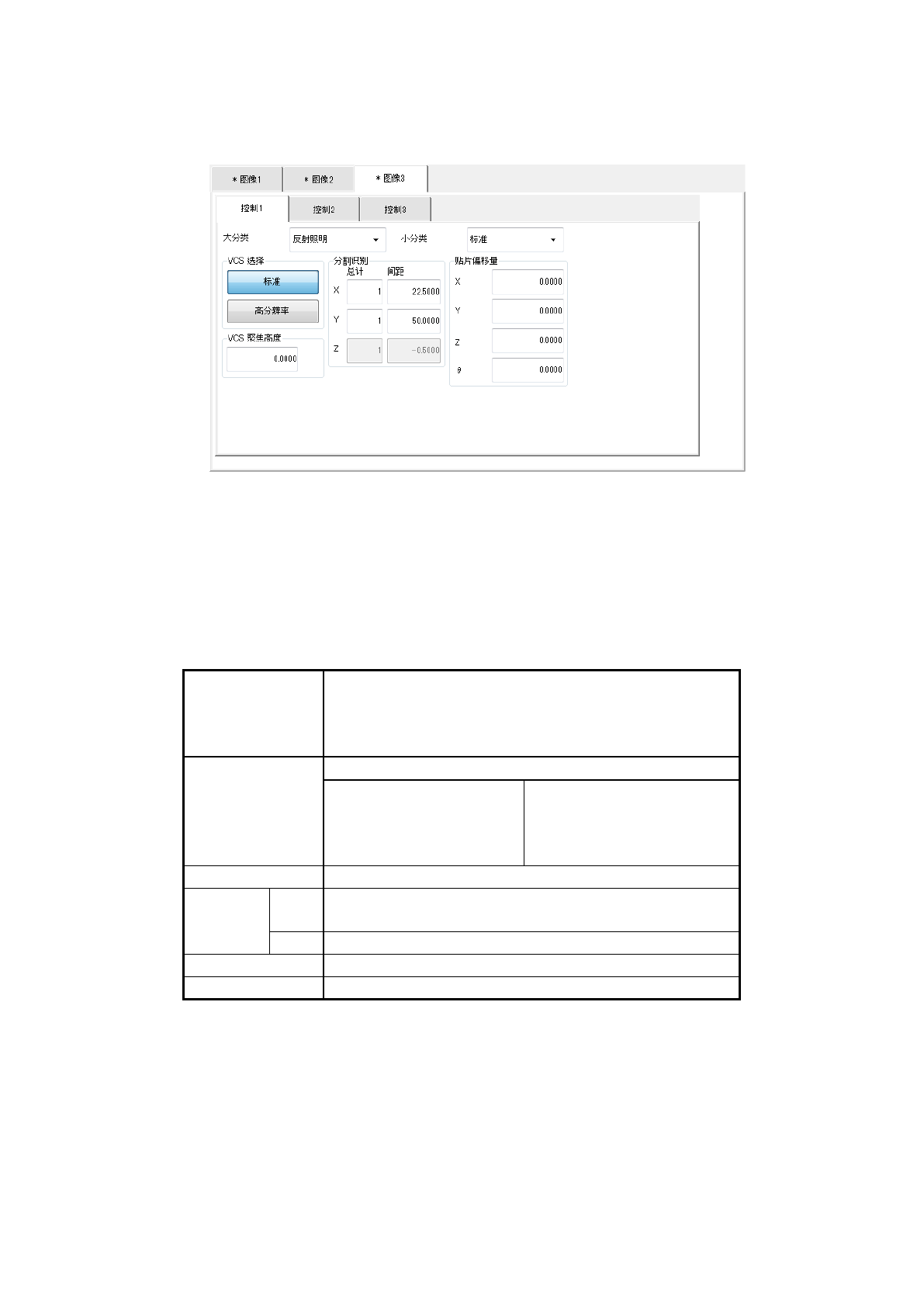 第 1 部 基本篇 第 4 章 制作生产程序 4- 124 (1 3 ) 照明控制数 据画面 选择图像 3 选项卡时,打开以 下画面。 [ 控制 1] 选项卡为带有分割照 明的设置选 项卡。 分割照明的设置 要按照以下步骤进行。 1. 设置识别 VCS 。 2. 决定分割识 别。 3. 决定照明的 大分类、小分 类(大分类为 “反射” 、 “ 侧面 ” 时 )。 4. 决定其他 设置 大分类 选择 照明的类 型。 ・ 反射照明 ・ 透过…