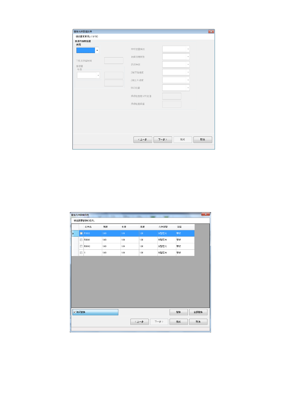 第 1 部 基本篇 第 4 章 制作生产程序 4- 173 显示元件数据选 项的内容。 在各数据中输入 要变更的相关值。 对话框的下部会 显示输入范围。 按 [ 上一步 ] 按钮返回到前一个画 面。 按 [ 下一步 ] 按钮移动到下一个画 面。 按 [ 取消 ] 按钮中断 处理,关闭 对话框。 显示目前为止输 入的 内容。 按 [ 替换 ] 按钮,可逐一变换选 择的记录数 据 。 按 [ 全部替换 ] 按钮,进行全部数据的 变换 。