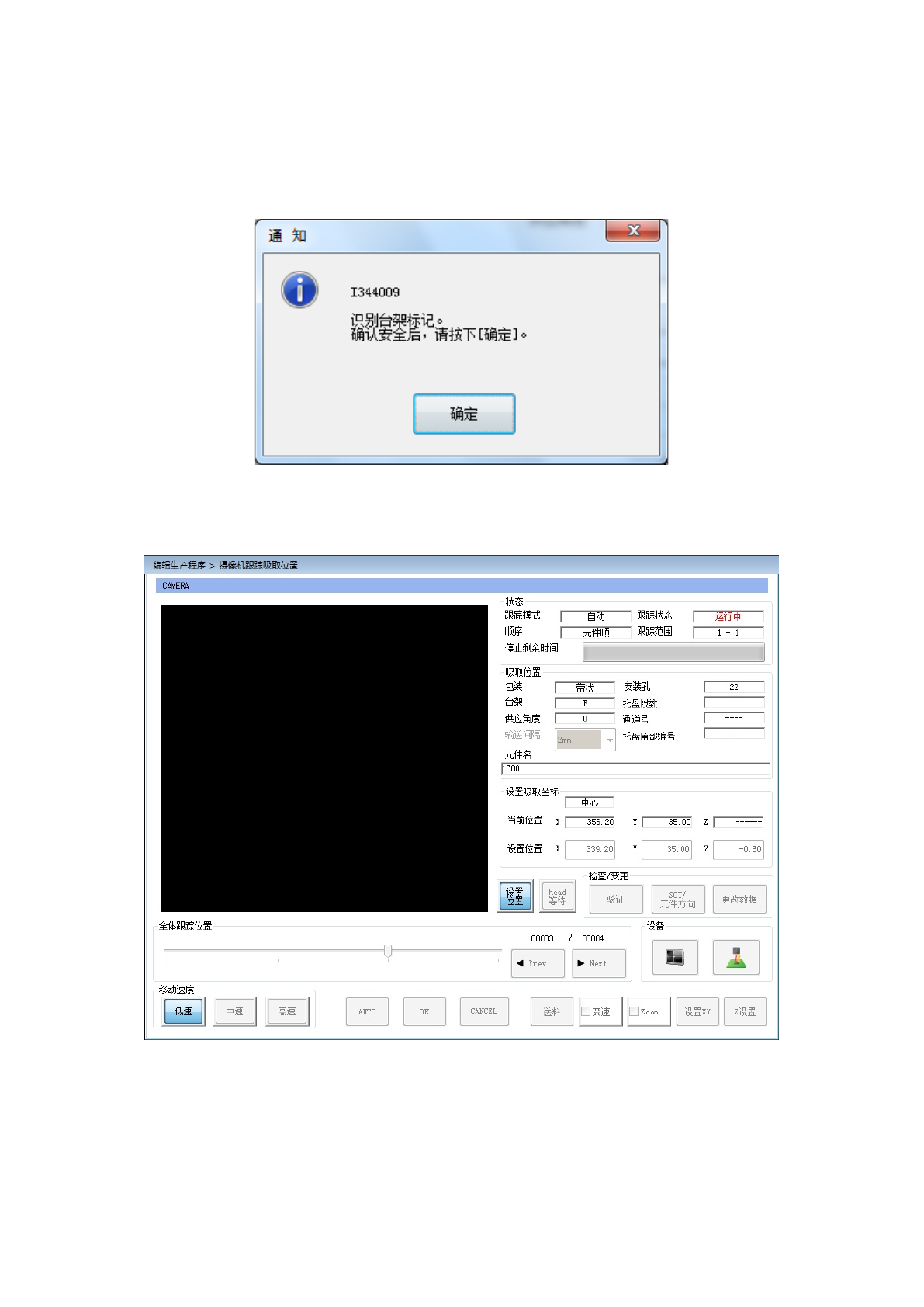 第 1 部 基本篇 第 4 章 制作生产程序 4- 242 (2) 执行台架标记 校准 在向各供料器台架跟踪移动前,如果已设置了台架标记识别,为了提高吸取 位置的精度,将执行台 架标记识别。 显示如下提示信 息,请按下 [ 确定 ] 。 (3) 正在执行 摄像机吸取位置 跟踪 / 吸取高度跟踪 执行后,各吸取 位置 ( 摄像机 ) 跟踪中显示 如下的画面。