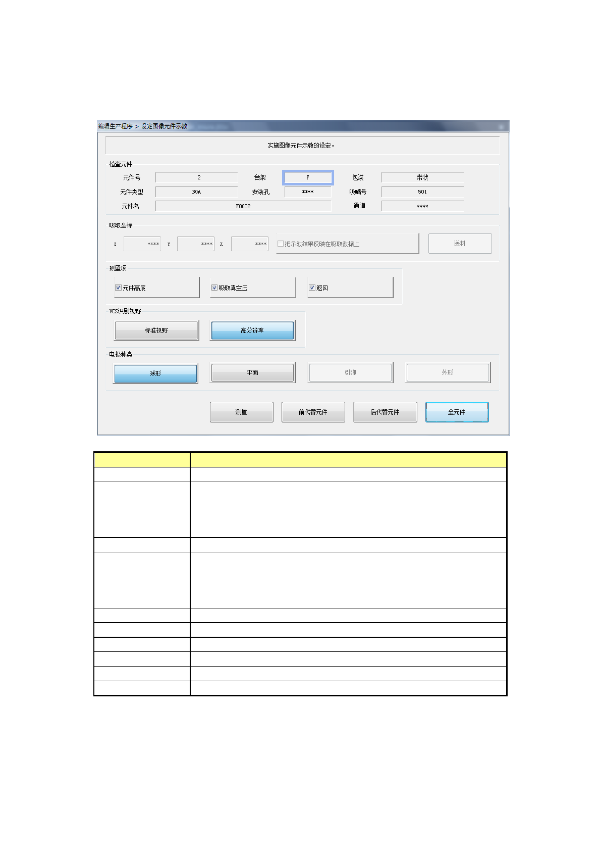 第 1 部 基本篇 第 4 章 制作生产程序 4- 291 ( 1 ) 元件示教的操作 1) 设置元件示教 从菜单中 选择 [ 测量 ]-[ 图像示教 ] ,显示如 下画面。 项目 概要 检查元件 显示执行元件示 教时必要的元件内容。 吸取坐标 显示吸取元件的 吸取位置内容。 可以改为前一个 代替元件或后一个代替元 件的吸取位置。 进行手动吸取等 无吸取数据时, 则不显示各个项目 ,不能改变吸 取 位置、送 料、示教。 送料按钮 执行 …