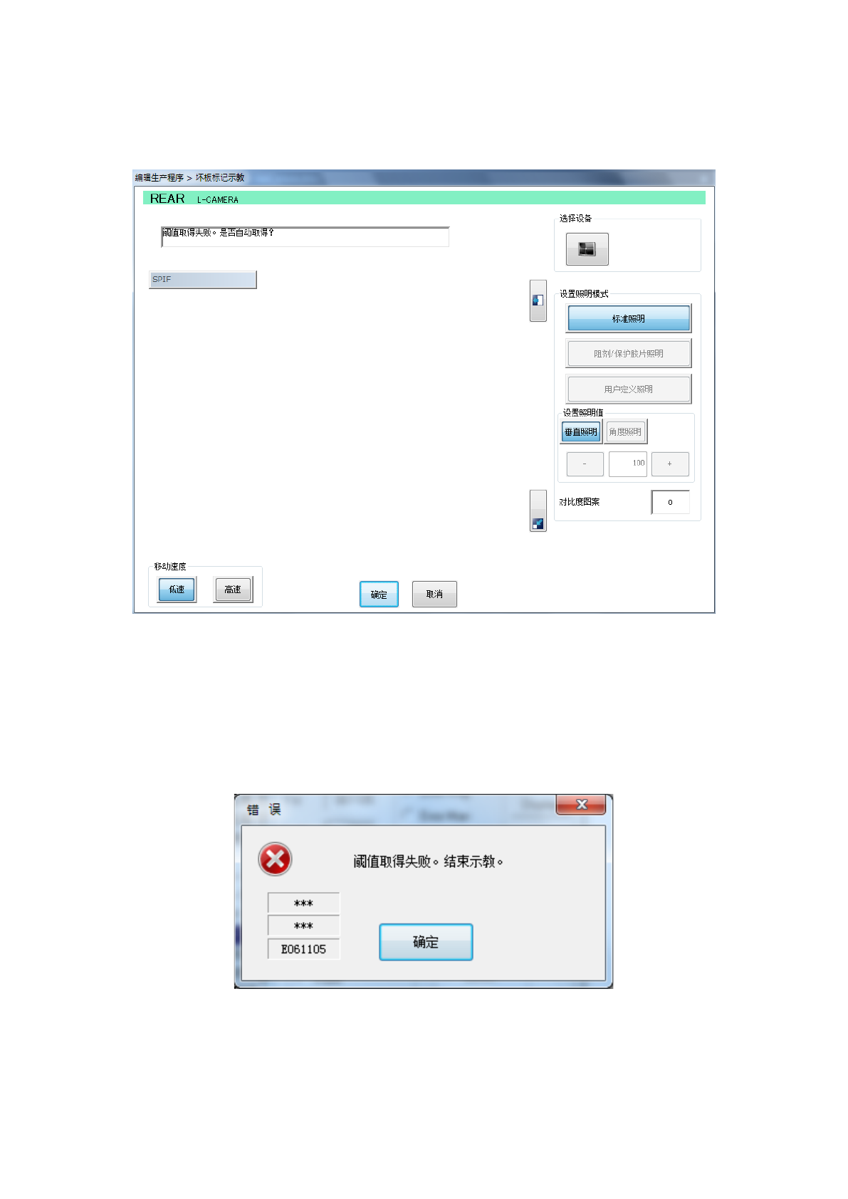在示教的 OCC 坏板标记识别阈值取得动作中取得失败时,显示「阈值取得失败。是否自动取得?」
