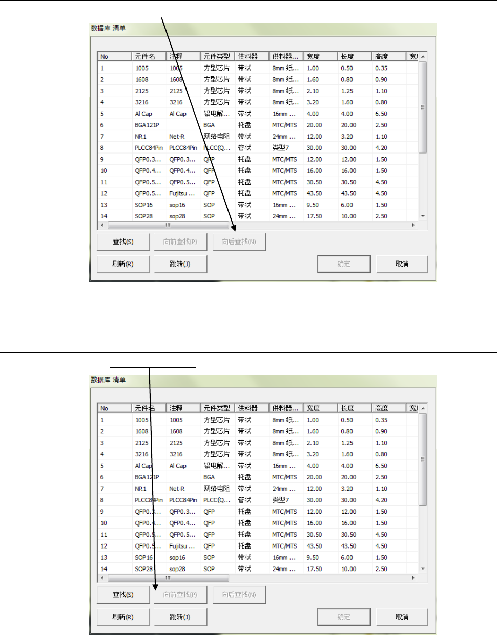 第 1 部 基本篇 第 5 章 数据库 5-8 5-1-3- 2 向后查找 在菜单栏中, 单击 「向后 查找」。 显示下一个与查 找条件一致的元件数据。 5-1-3- 3 向前查找 在菜单栏中, 单击 「向前 查找」。 显示当前显示的 元件数据以前的、符合查 找条件的元件数据。
