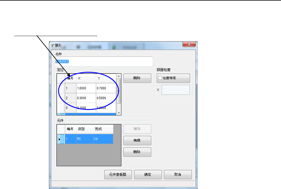 第 2 部 功能详解篇 第 6 章 通用图像元件 6- 11 6-2- 2 制作扩展列数据格式 在通用图像元件 数据制作初始画面中选择 “ 扩展列数据格式 ” ,则 显示如下 的画面。 基本的制作 方法与 “ 元件要素 组 / 元件 要素格式 ” 的制作方法相 同, 但对于 “ 扩展列数 据格式 ” ,需 逐 一 指定元件 要素 的 X 、 Y 坐标进行配置。 在 “ 定位 ” 上逐一配置元件 要素 。 X 、 Y 坐标是从元件 中心位…