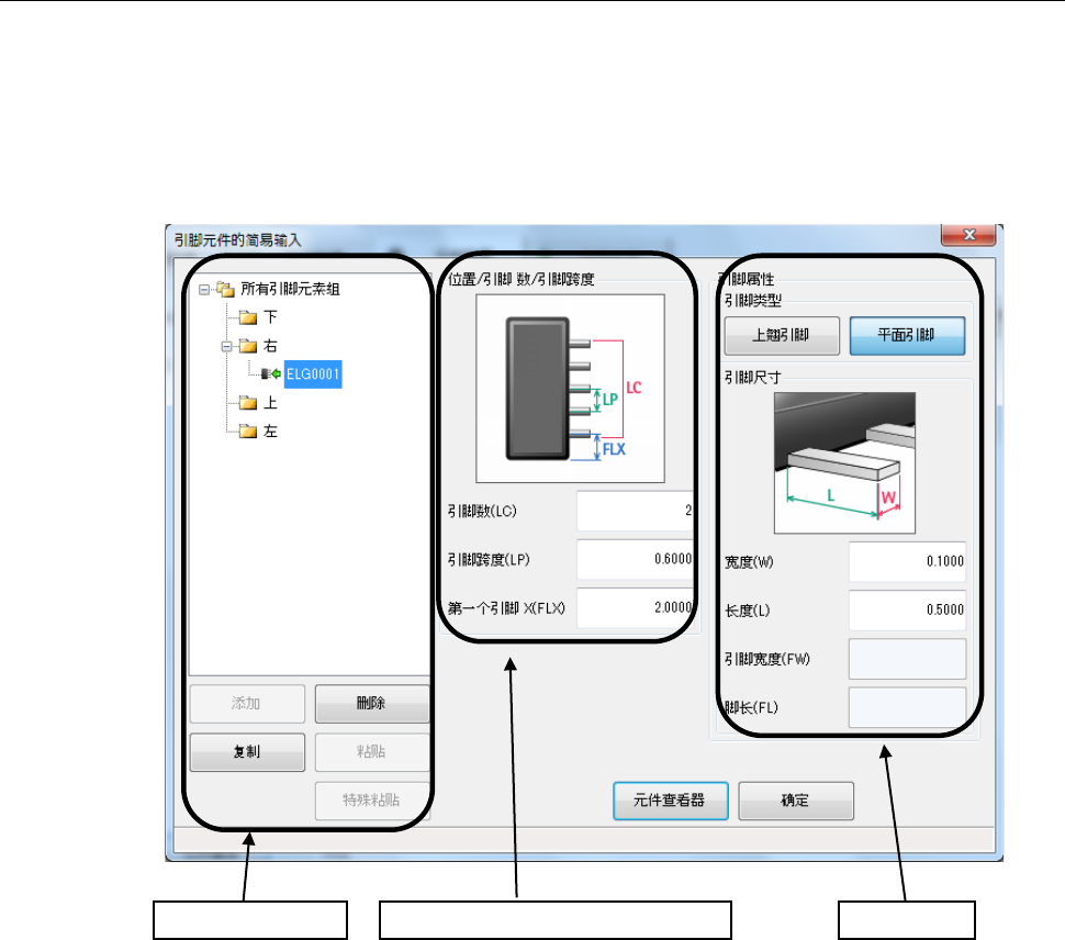 引脚元件简易输入画面由“所有引脚要素组一览”、“引脚位置、引脚数、引脚跨度”、“引脚属性”3