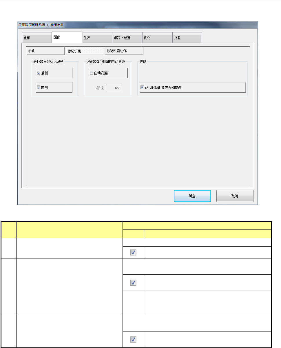 第 2 部 功能详解篇 第 7 章 操作选项 7-8 7-3- 3 标记识别动作 按下[标记识别 ]按钮后,显示 “ 标记识 别动作选项设置 画 面 ”。 No. 项目 内容 状态 动作及详细内容 1 优先 B OC 标记识别 设置优先识别 BOC 标记还是坏板 标记。 优先识别 BOC 标记,再识 别坏板标记。