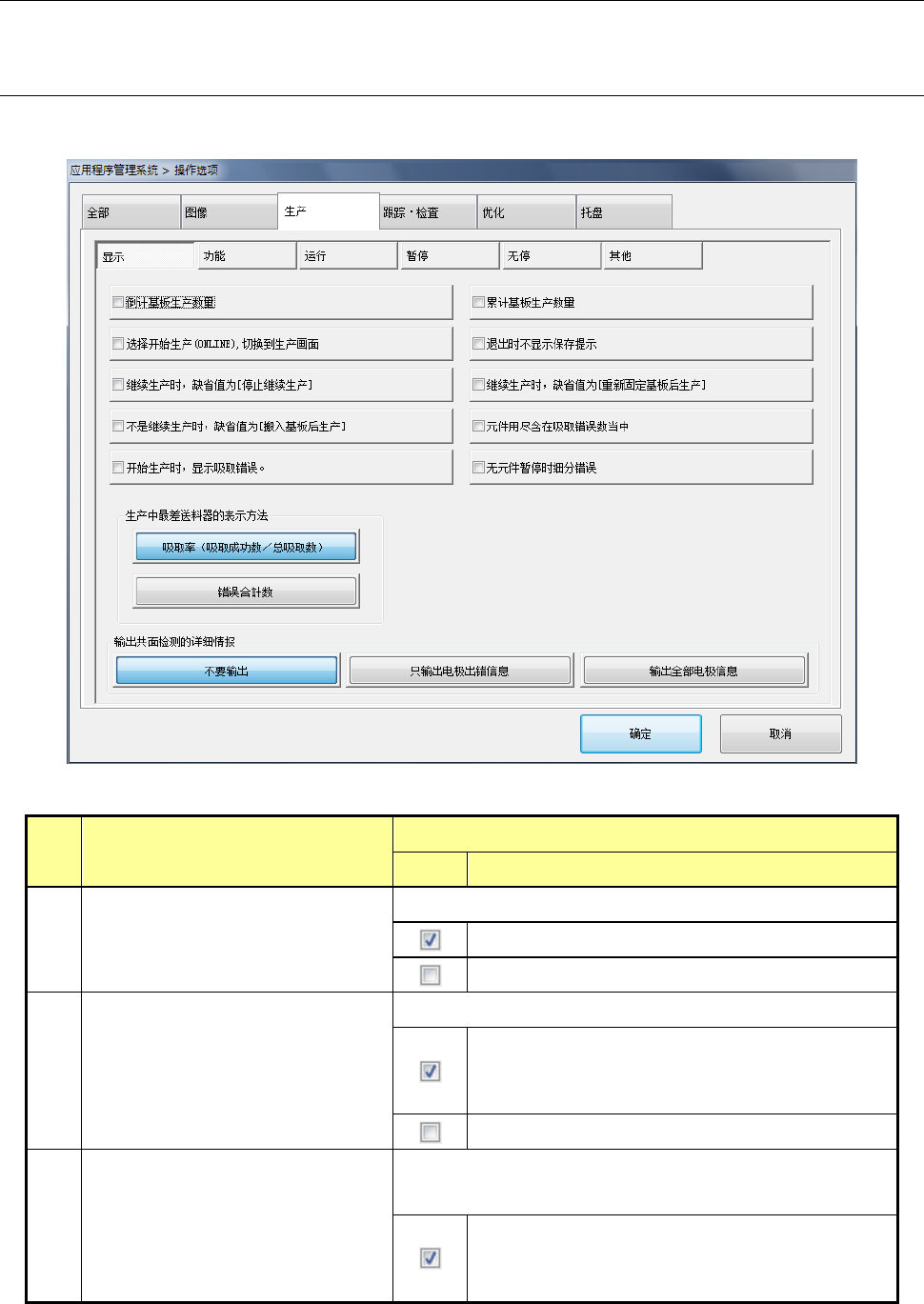 第 2 部 功能详解篇 第 7 章 操作选项 7-9 7- 4 生产 设置生产时处理 的操作选项。 7-4- 1 显示 按下 [ 显示 ] 按钮后,画面 上会显示 “ 生产时显 示的选项设置画 面 ” 。 序 号 项目 内容 状态 动作及详细内容 1 倒计基板生产数 量 对基板生产数量 的显示方法进行设置。 显示剩余的预计 生产数量。 显示实际生产数 量。 2 累计基板生产数 量 对生产基板数量 的更新方法进行设置。 不清除生产管理信息…