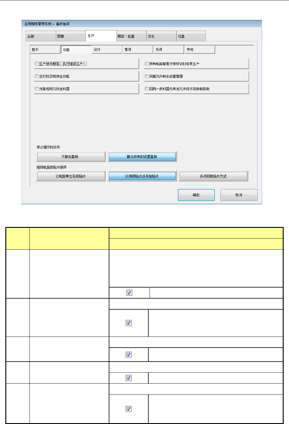 第 2 部 功能详解篇 第 7 章 操作选项 7- 11 序 号 项目 内容 状态 动作及详细内容 10 无元件暂停时细 分错误 在 无元件暂停 对话框 中显示的发生错 误的 Hea d 的判 定 是激光、还是真 空。 在 无元件暂停 对话框中显示 「判定」 项目 , 显示 无元件的判定。 在 无元件暂停 对话框中不显 示 「判定」 项目。 1 1 生产中最差送 料器的表示方法 指定在生产实行 中画面上最差供料器的表 示方法。 吸取率(…