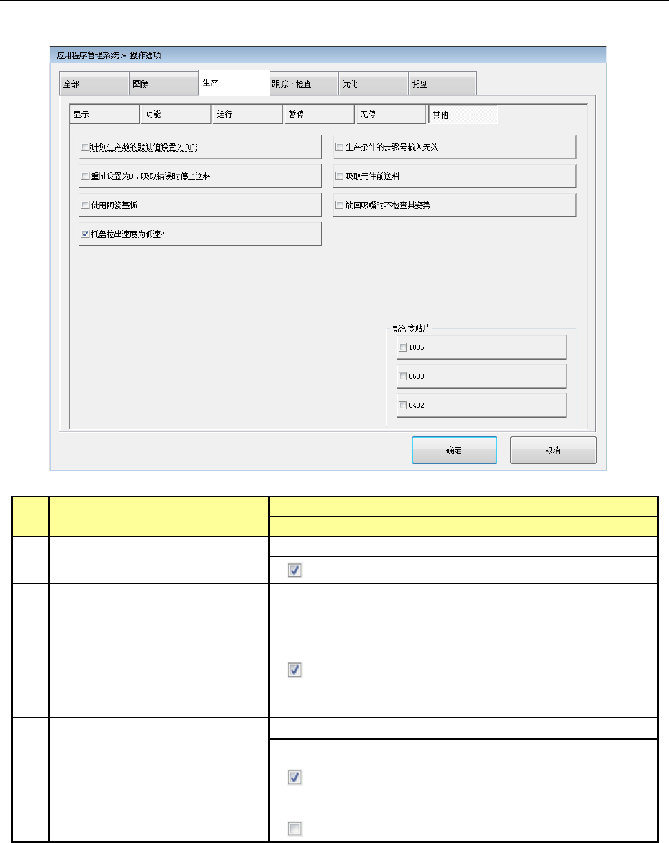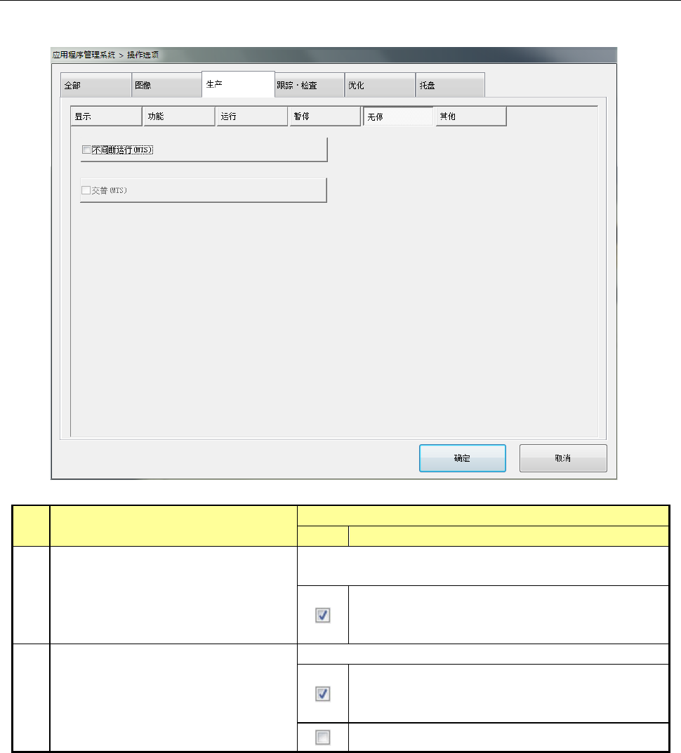 第 2 部 功能详解篇 第 7 章 操作选项 7- 20 7-4- 6 其他 按下[其他] 按钮,会显示 “ 生产 的其他设置 画 面 ”。 No. 项目 内容 状态 动作及详细内容 1 计划生产数的默 认值设置为 [0] 设置计划生产数 量的默认值为 0 的功能 。 计划生产数 默认值为 0 。 2 生产 条件 的 步骤号输入 无效 设置生产 条件画面的步骤 号、 开始 行、 结束 行均不可输入的 功能。 使 生产条件画面的步骤 号、…