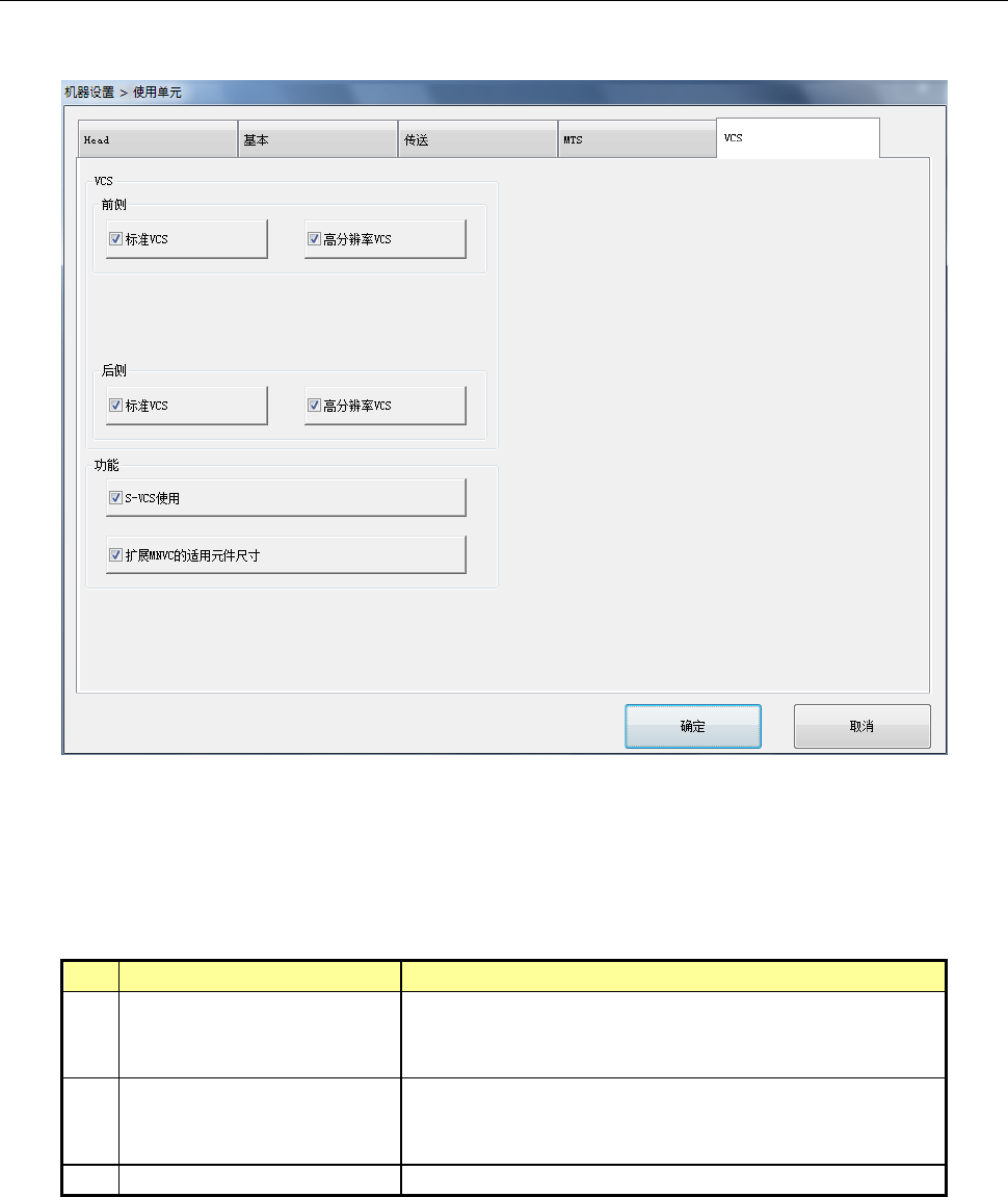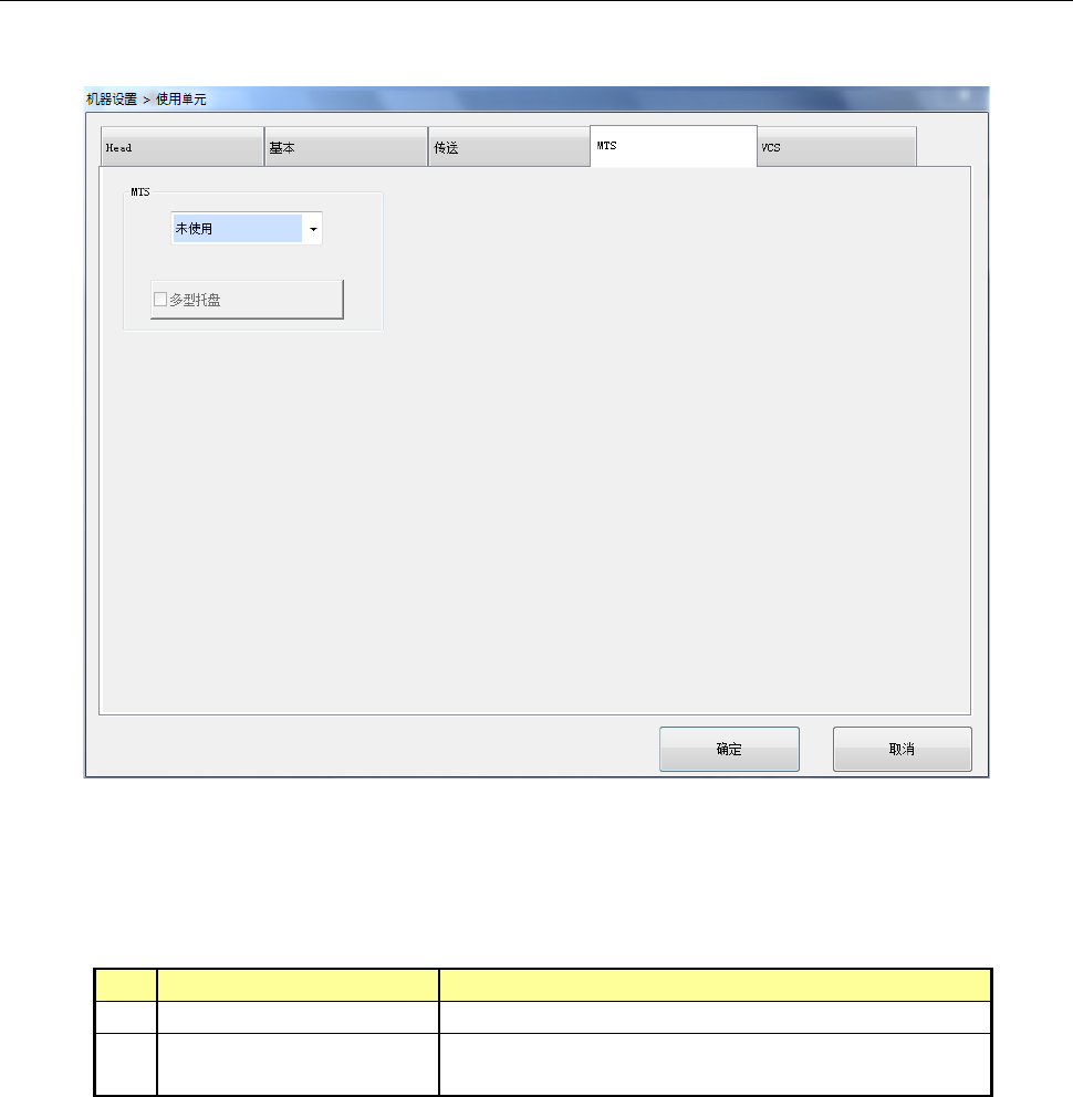 第 2 部 功能详解篇 第 8 章 机器设置 8- 13 8-3-1- 4 MTS 选择 MTS ,会显示 以 下画面 。 点击各选项卡, 可指定 [ Head ] 、 [ 基本 ] 、 [ 传送 ] 、 [MTS] 、 [VCS] 。 (1) 设置项目 设置 MTS 功能的使用。 No. 项目 设置内容 1 MTS 设置单元 使用/未使用及类 型 。 2 多型托盘 使用 MTS 时,可设置 此项 。 设置多型托盘的 使用/未使用。 (…