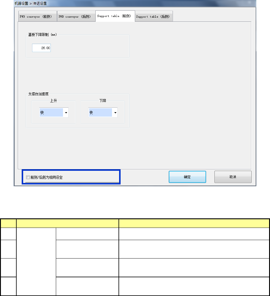 第 2 部 功能详解篇 第 8 章 机器设置 8- 28 8-3-3- 2 支撑台 选择支撑台,会 显示以下画面。 点击各选项卡, 可指定 [ 基板 传送 ] 、 [ 支撑台 ] 。 双通道传送时, 将「前侧 / 后侧为相 同设置」设定为 OFF ,也可 分别设定 前后通道。
