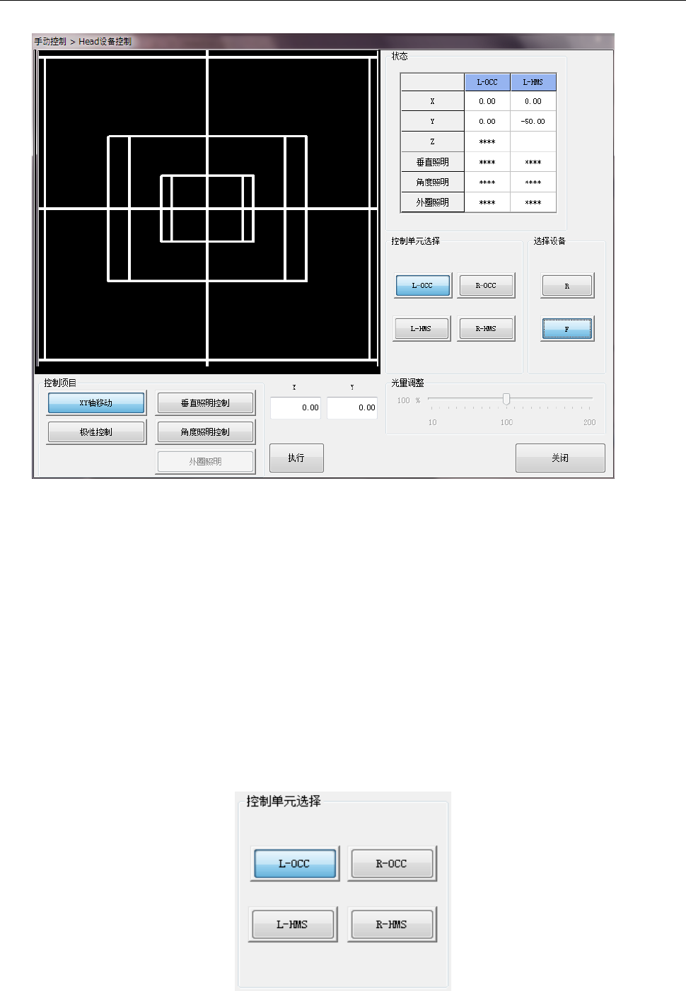 第 2 部 功能详解篇 第 9 章 手动控制 9-7 (3) 控制 项目 用单选按钮选择 控制项目。 控制单元不同, 显示的按钮不一样。 1) OCC a)XY 轴移动 与 Head 控制 的 XY 轴移动 相同。 b) 垂直照明 控制 对 OCC 的垂直照 明的 ON/OFF ,进行控制 。 · 移动 滑动条,设定 光量。 · 选择 “垂 直照明 控制 ” 时 , 按 [ON] 按钮, [OFF ] 按钮, [O N /OFF] 按钮…