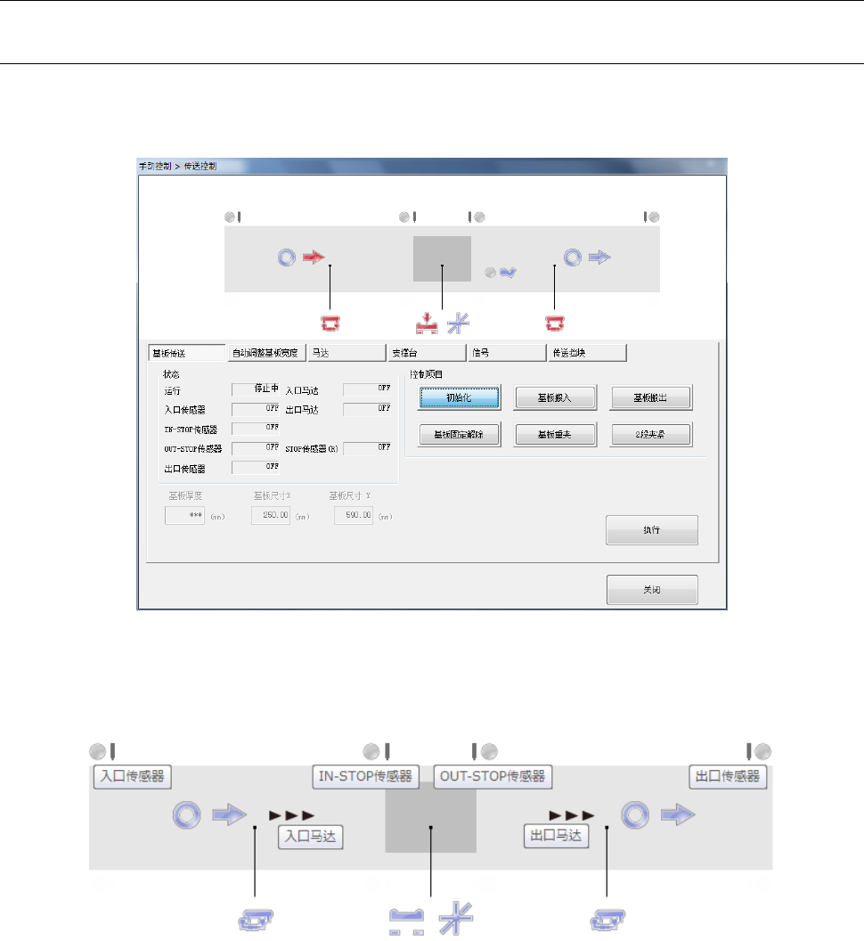 第 2 部 功能详解篇 第 9 章 手动控制 9- 17 9- 4 传送系 9-4- 1 传送控制 从下拉菜单中选 择 [ 传送 系 (C ) ]-[ 传送控 制 (V) ] 、 或点击命 令按钮中的 [ 传送控制 ] 后, 可显 示传送控制画 面。 选择菜单的 [ 传 送系 ] → [ 传送控制 ] 后,即显示 传送控 制的对话框。 在画面上部显示 各传送 传感器 ·传送马达 的 状态 。 IN 侧 的传送挡 块及挡块传 感器在选项 …
