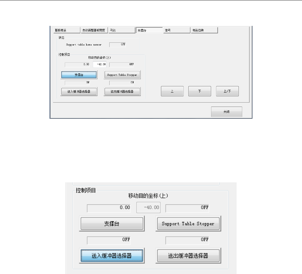 第 2 部 功能详解篇 第 9 章 手动控制 9- 24 9-4-1- 4 控制对象:支撑台 按下 [ 支撑 台 ] 按钮,即可显示 以下画面 。 ・ 支撑台 ( 单通道 ) (1) 状态 显示 原点传感器 的 状态 。 (2) 控制项目 用单选按钮选择 控制项目。 按下 控制按钮后, 即开始进行 与被选择项目 对应的 控制。 1) 支撑台 控制支撑台上下 。 选择 [ 支撑台 ] 时, 按 [ ON ] 按钮 , [ OFF ] 按钮…