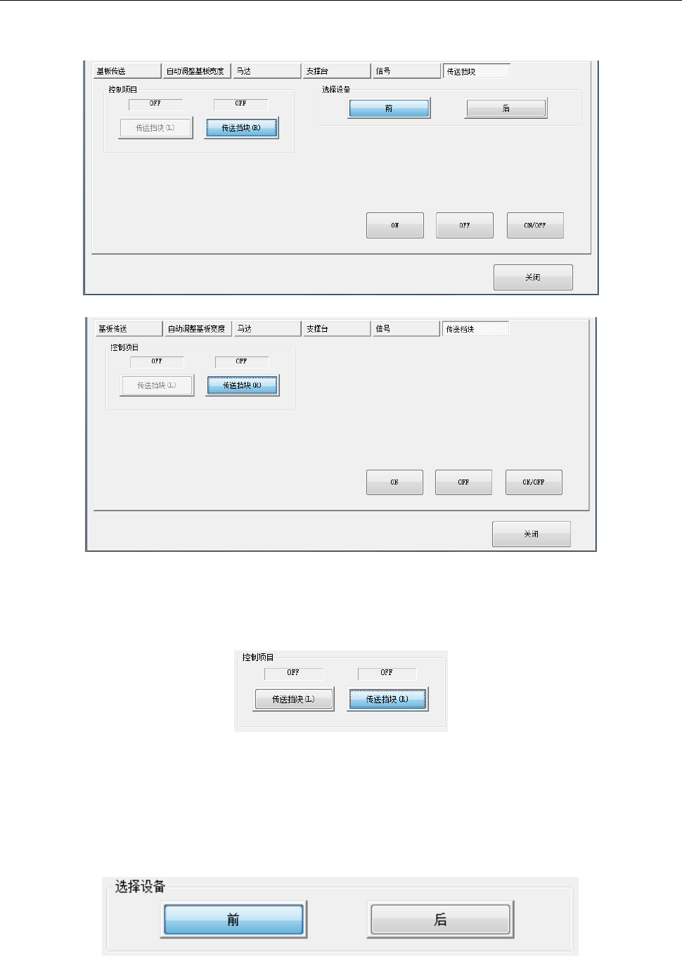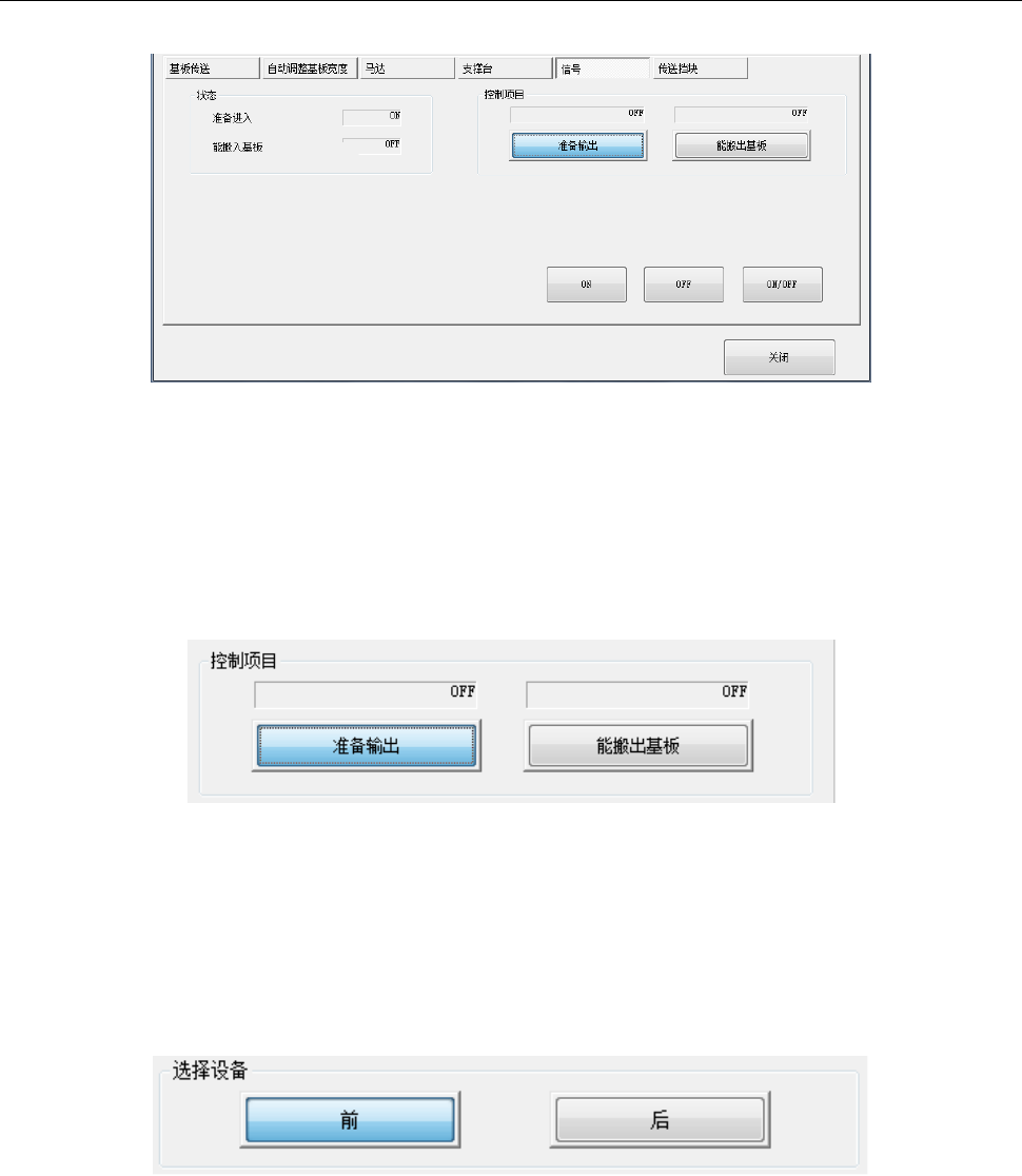按[ON]按钮、[OFF]按钮、[ON/OFF]按钮控制选择的传送挡块的 ON/OFF。