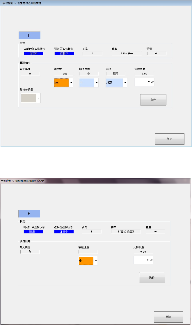 第 2 部 功能详解篇 第 9 章 手动控制 9- 33 (3 ) 设定 连接 电动送料器 或 电动 管式送料器 , [ 设定 ] 按钮即为 有效。 按下 [ 设定 ] 按钮,即显示 选择 中的 送料器属性 设定对话框 。 请从组合框选择 传送速度或编带种类后, 按下 [ 执行 ] 按钮。 [ 电动 台架连接状态 ] , [ 送料器连接 ] 为 [ 未连接 ] 时,不能进行 [ 执行 ] 操作。 < 电动 送料器 > <…