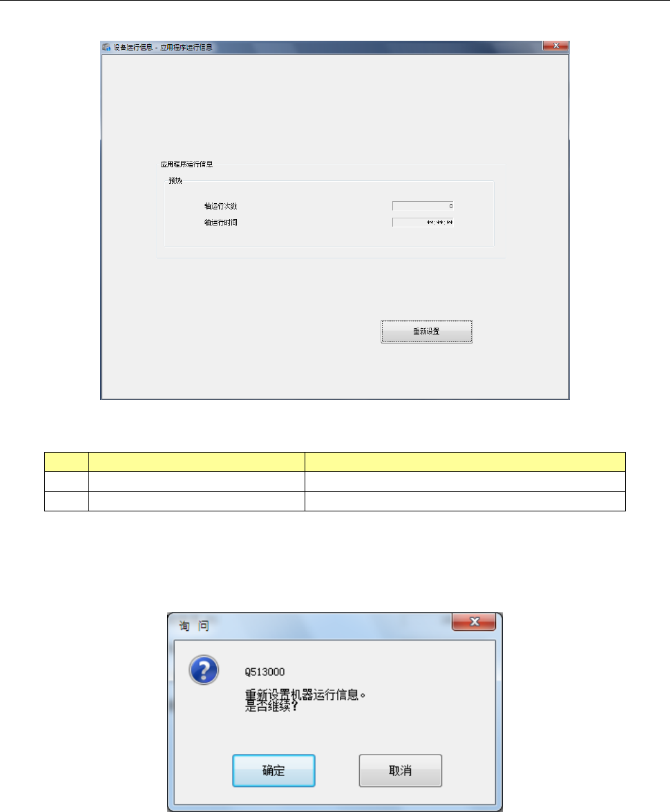第 2 部 功能详解篇 第 10 章 设备运行信息 10 -5 10 -3- 2 应用程序运行信息 从主菜单中选择 [ 机器 ]-[ 应用程序运行 信息 ] ,可 显示应用程序运 行信息画面。 (1) 应用程序 运行信息 No 项目 内容 1 轴运行次数 预热时轴的运行 累计次数。 2 轴运行时间 预热时轴的运行 累计时间。 (2) [ 重新设置 ] 按钮 按下 [ 重新设置 ] 按钮或 主菜单的 [ 初始化 ] - [ 重新设置 ] …