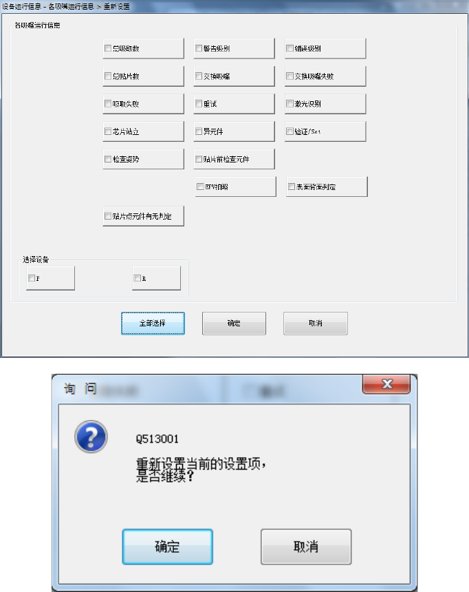 ・ 点击需要重新设置的项目复选框,按“确定”后,可显示“重新设置询问信息”画面。