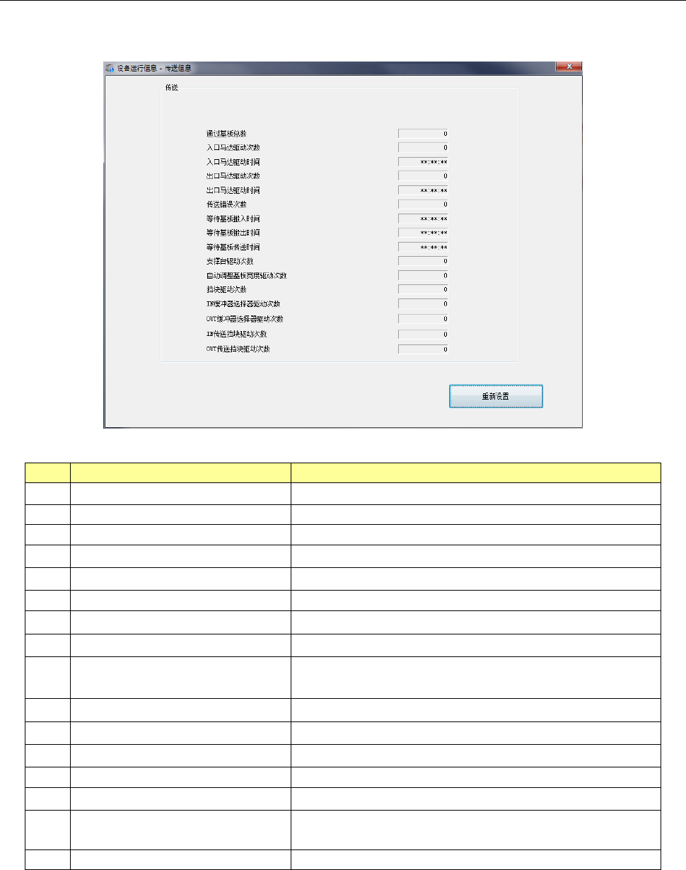 第 2 部 功能详解篇 第 10 章 设备运行信息 10 - 16 10 -3- 7 传送运行信息 从 主菜单中选 择 [ 机器 ] - [ 传送 运行信息 ] 后, 可显示 传送 运行信息画面 。 (1) 传送 ・ 单通道 No. 项目 内容 1 通过基板总数 通过的基板张数 累计。 2 入口马达驱动次 数 搬入马达驱动次 数的累计。 3 入口马达驱动时 间 搬入马达驱动时 间的累计。 4 出口马达驱动次 数 出口马达驱动次 数的累计…