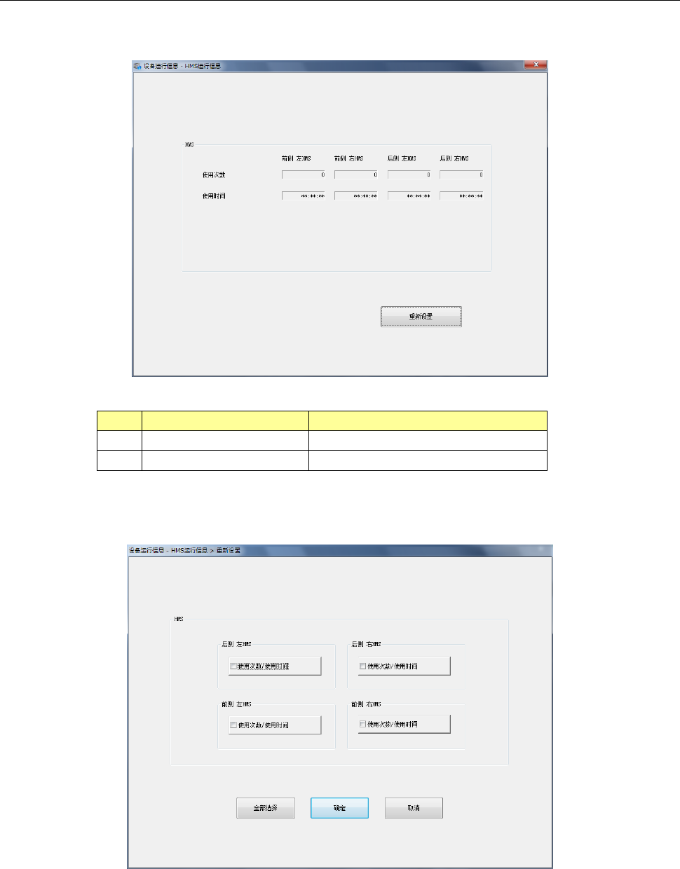 第 2 部 功能详解篇 第 10 章 设备运行信息 10 - 26 10 -4- 3 HMS 运行信息 选择 主菜单 的 [ 识别· 检查 ] - [HMS 运行信息 ] ,即可显示 H MS 运行信息画面 。 (1) HMS No. 项目 内容 1 HMS 使用次数 使用 HMS 的次数累计。 2 HMS 使用时间 使用 HMS 的时间累计。 (2) [ 重新设置 ] 按钮 按下 [ 重新设置 ] 按钮或 主菜单 的 [ 初始化 ] …