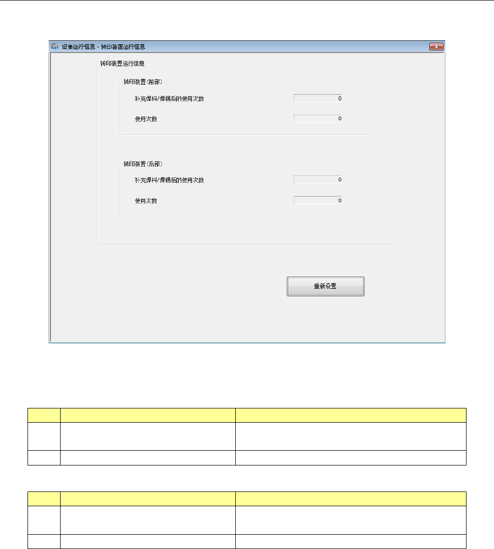 第 2 部 功能详解篇 第 10 章 设备运行信息 10 - 32 10 -4- 9 转印装置运行信息 选择主菜单 的 [ 识别 · 检查 ] - [ 转印装置运 行信息 ] ,即显示 转印装置运行信息 画面。 仅安装有直线型 转印装置选项、 旋转型转印装置 选项 的机器才会显 示此画面。 (1) 转印 装置运行信息 < 直线型转印 装置> No 项目 内容 1 补充 焊料 / 焊锡后 的使用 次数 用于 计算 焊料 / 焊锡 的剩余量…