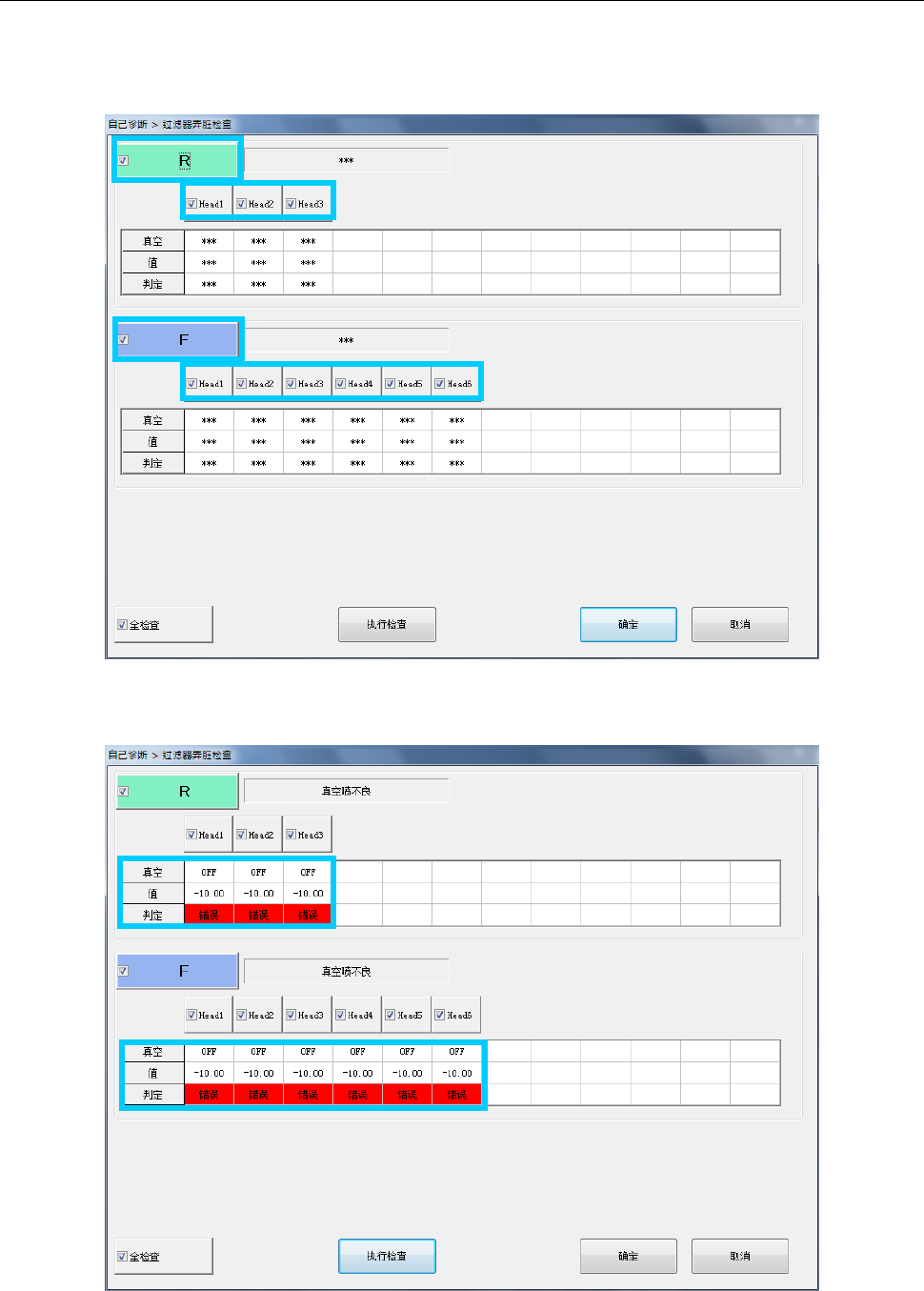 指定要检查的供料器台架,或 Head,按下[执行检查]按钮,执行过滤器脏污检查。