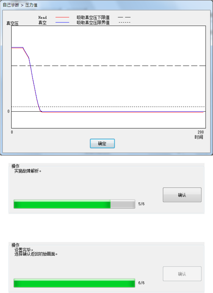 第 2 部 功能详解篇 第 11 章 自己诊断功能 11 - 20 设定 H ead 移动到真 空校准上面,计测真空到 达状况 3 次。 设定 H ead 移动到真 空校准上面 ,计测自然 破坏状况 3 次。 ・ 显示第 2 次和第 3 次的平均值。 ・ 计测后显示的压力值图 表,是第 3 次的数据。 ・ 请按下[确 认]。