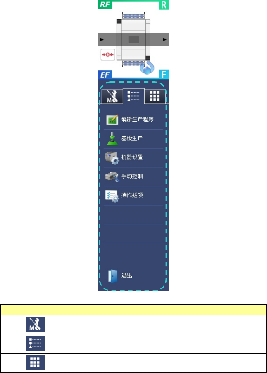 第 1 部 基本篇 第 1 章 装置概要 1- 77 (2) 信息区域的功 能按钮 信息区域的功能 按钮配置在以下位置,通 过选项卡切换显示使用。 应用程序启动中 ,有可能任何 选项卡都无法 选择。 No. 图标 名称 概要 1 维护选项卡 显示个别的维护信息 显示菜单。 2 应用程序快捷方 式 显示应 用程序快 捷方式及退出菜 单。 3 键盘选项卡 显示软键盘。
