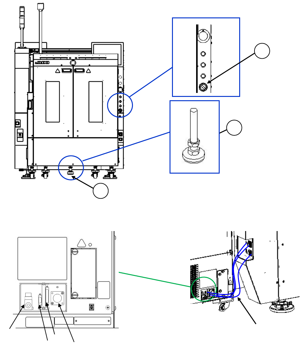 旋转 4 处脚轮调节器,将①贴片机的台架支撑下面与 TR7DN 的②连接块上面调整为相同高度。
