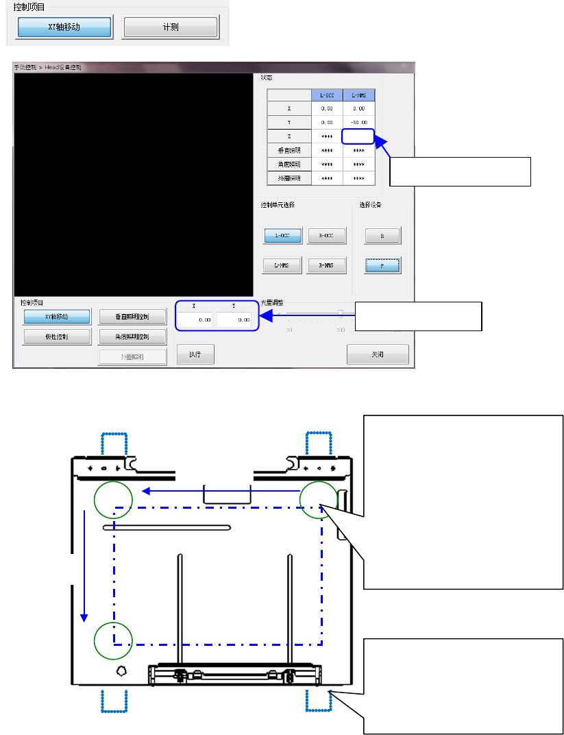 确认画面,点击画面的 XY 轴移动及 Z 高度计测⇔反复调整调节器的高度,使空白状态的托盘底座上部