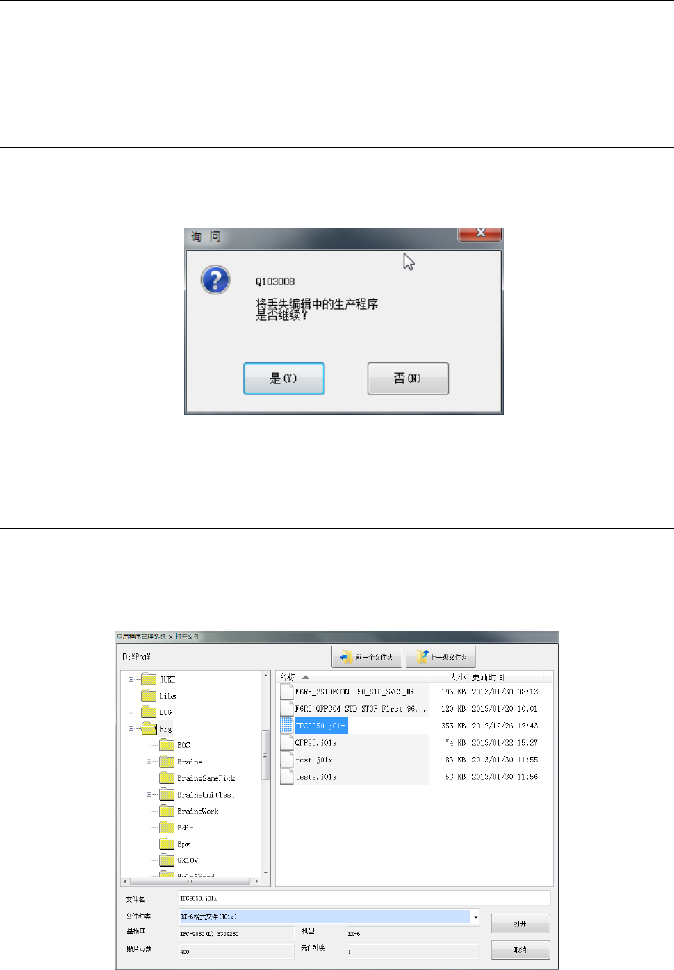 第 1 部 基本篇 第 1 章 装置概要 1- 81 1- 9 文件的操作 以下对文件的操 作方法进行说明。 本节对「 控制数据管理 」以外的项目进行 说明。 关于「控制数据 管理」,请参见「 13- 2 :控制数 据管理 」。 1-9- 1 新建 新建文件时, 请选择菜单的 「 文件 」 / 「 新建 」。 进行生产程 序数据初始化 。 如有未保存的生 产程序,则显示确认信息 。 在此 , 按下 「 是 」 , 则不保存文件而直接…