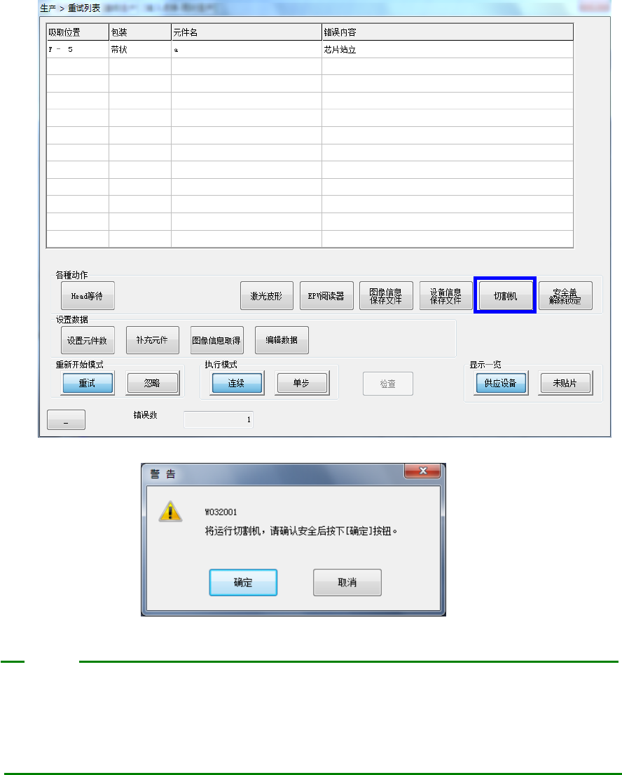 按下[切割机]按钮后,将显示警告信息,此时若按下[确定]即进行切割动作。