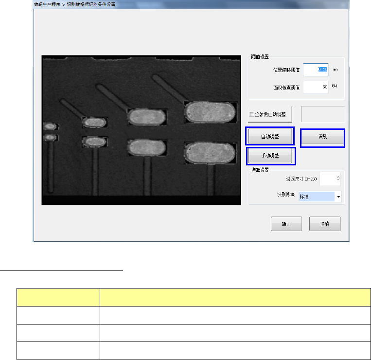 在[识别焊锡标记的条件设置] 画面上选择 [自动调整]按钮,可一边变更参数,一边反复进行识别,自