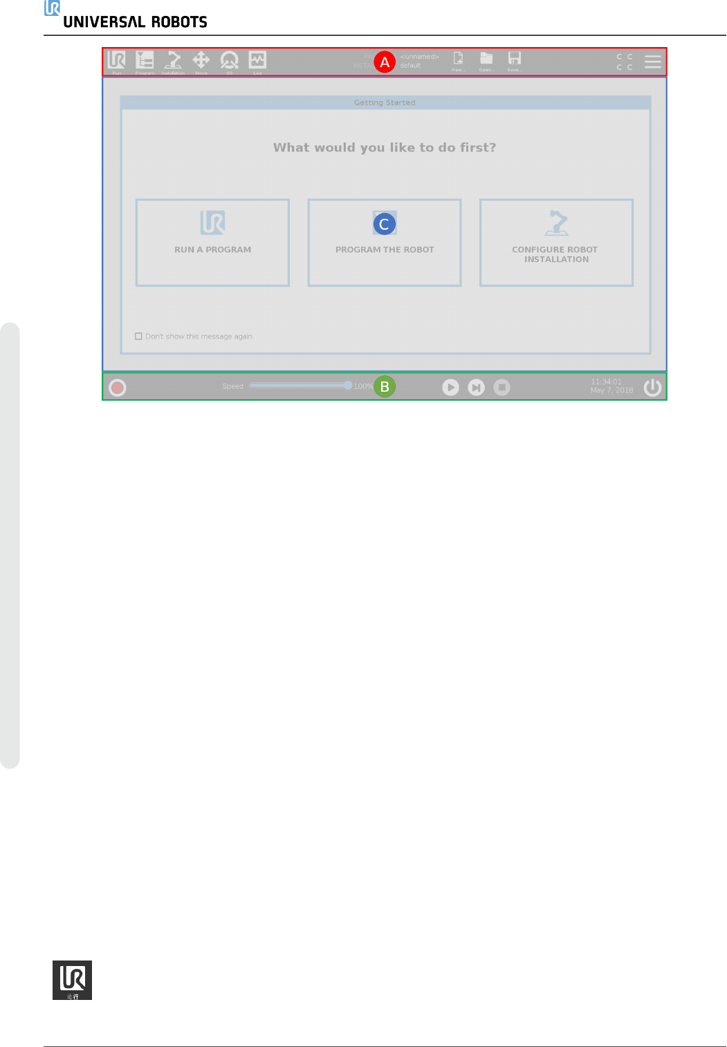 PolyScope 中为机器人创建、加载和执行程序。PolyScope 界面的构成情况如下图所示: