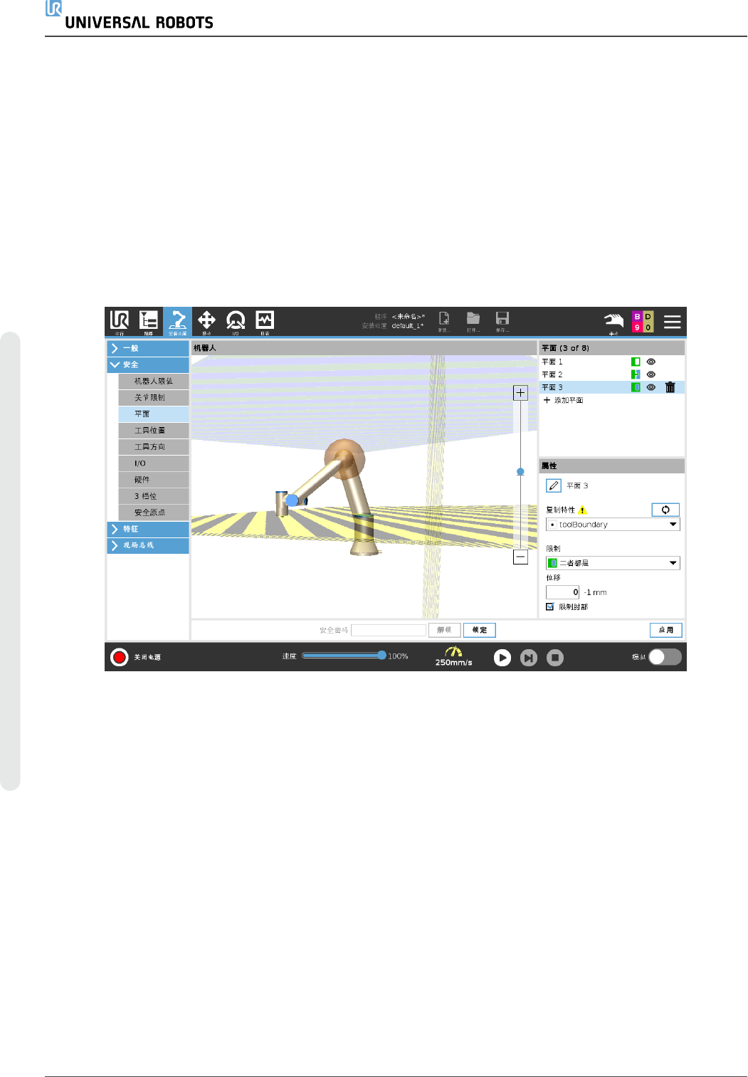 提 示 平 面 的 配 置 完 全 基 于 特 征 进 行 。 我 们 建 议 您 在 编 辑 安 全 配 置 之 前 创 建 并 命 名 所 有 特 征 , 因 为 一 旦 安 全 选 项 卡 被 解 锁 , 机 器 人 将 会 断 电 , 将 不 可 能 移 动 机 器 人 。 安 全 平 面 限 制 了 机 器 人 的 工 作 空 间 。 最 多 可 定 义 八 个 安 全 平 面 用 来 限 制 机 器 人 工 具 和 肘 部 …