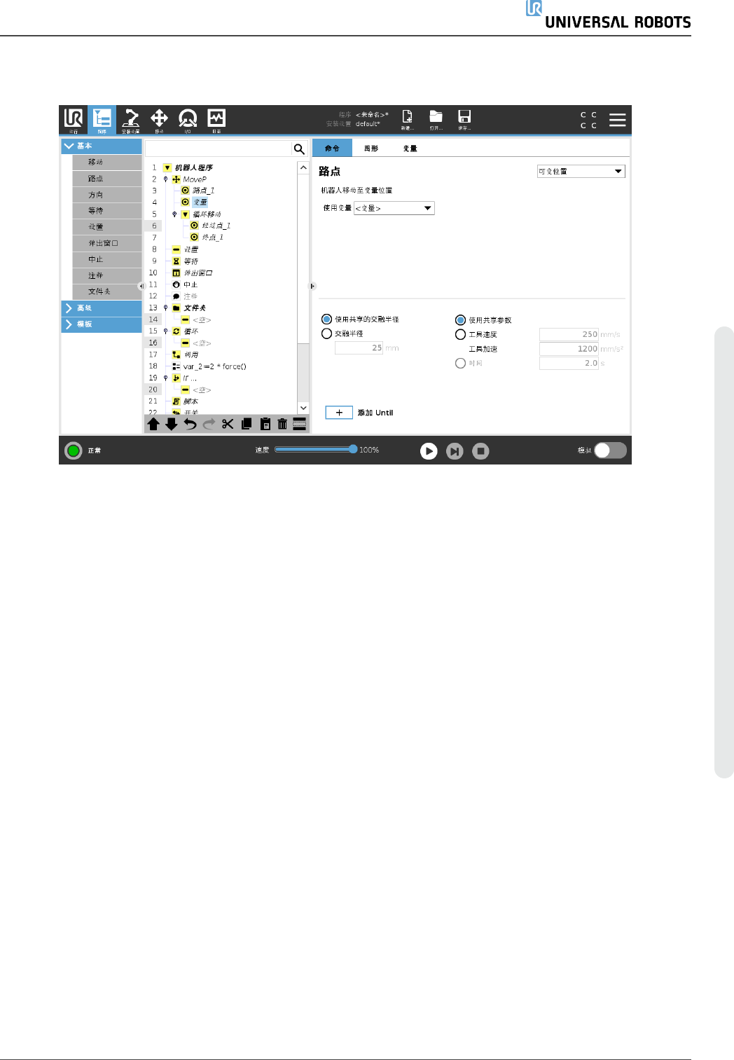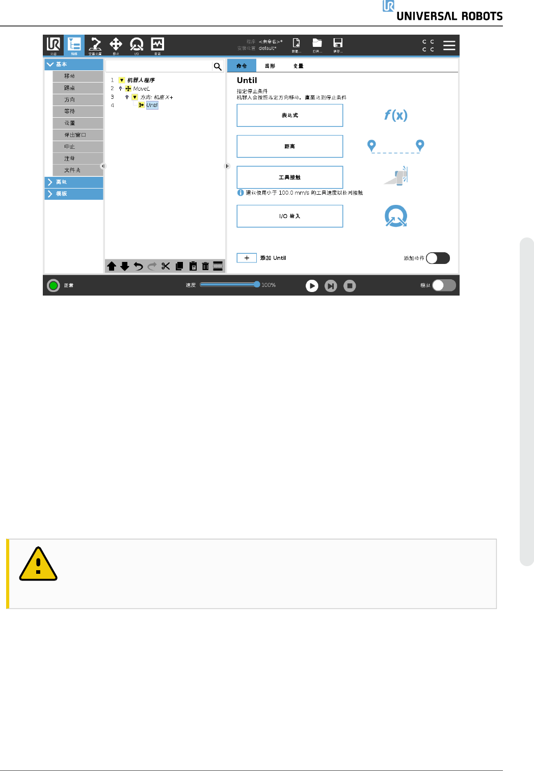 程序节点 Until 定义运动的停止条件。机器人沿着路径移动并在检测到接触时停止。在“程序