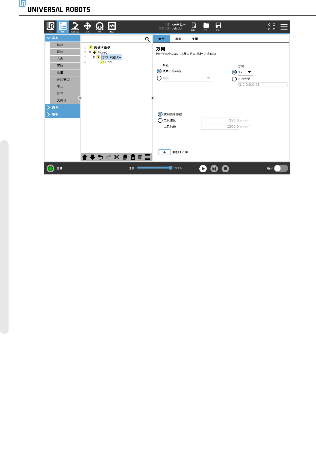 添 加 方 向 移 动 1. 在 “ 基 本 ” 下 , 点 按 方 向 , 向 程 序 树 中 添 加 一 个 线 性 移 动 。 2. 在 方 向 字 段 中 的 “ 特 征 ” 下 , 定 义 线 性 移 动 。 停 止 方 向 移 动 1. 在 “ 方 向 ” 字 段 中 , 点 按 添 加 U nti l 按 钮 , 以 定 义 停 止 条 件 并 将 其 添 加 到 程 序 树 。 您 可 为 工 具 速 度 和 工 具 加…
