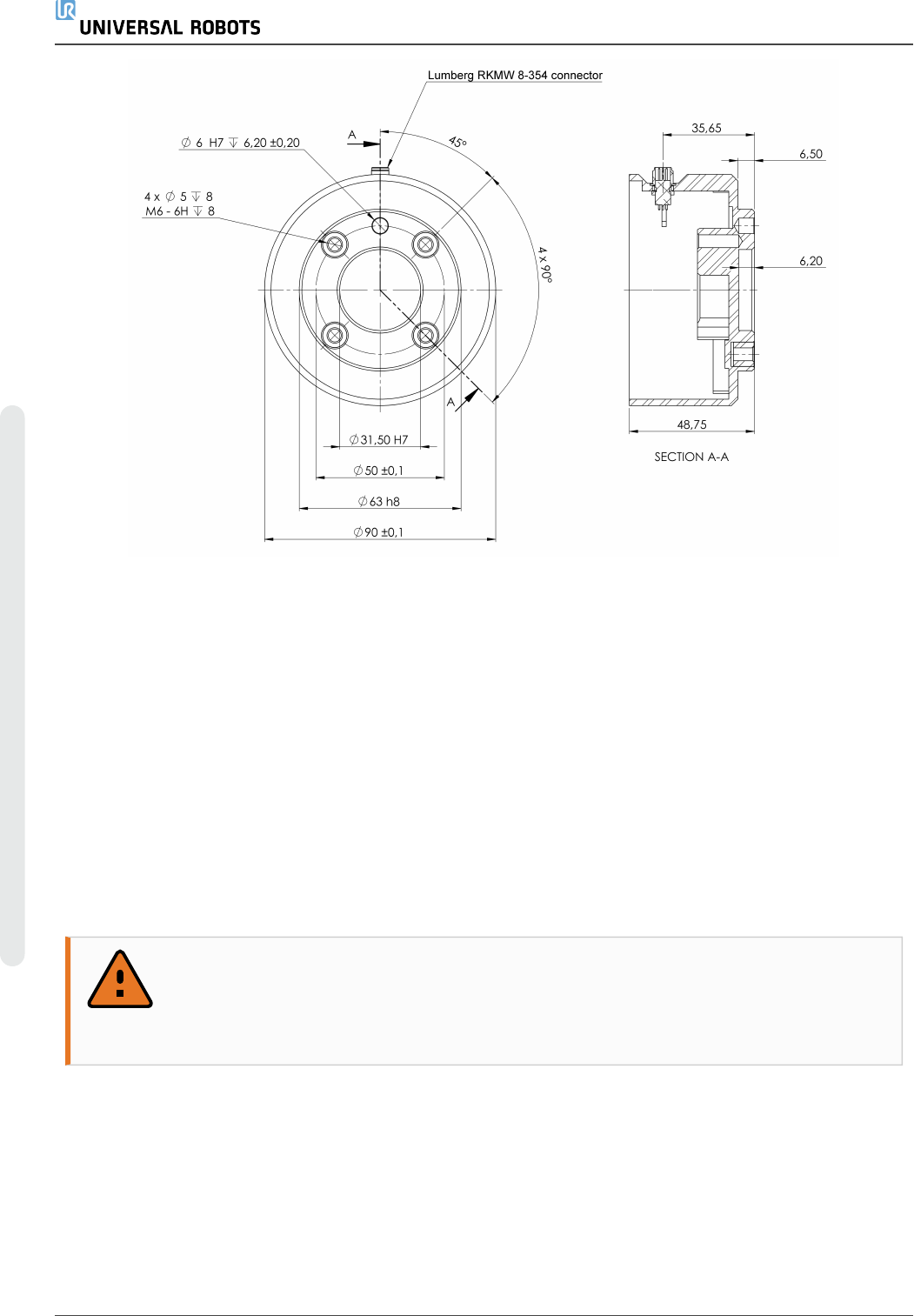 机器人工具法兰有四个 M6 螺纹孔,可用于将工具连接到机器人。M6 螺栓必须使用 8 Nm 的扭