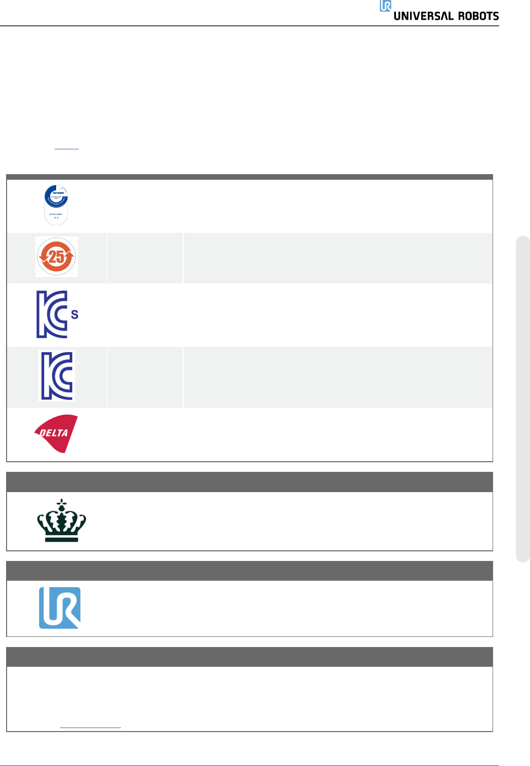 第三方认证是自愿的。不过,为了向机器人集成商提供最佳服务,Universal Robots 选择在下列