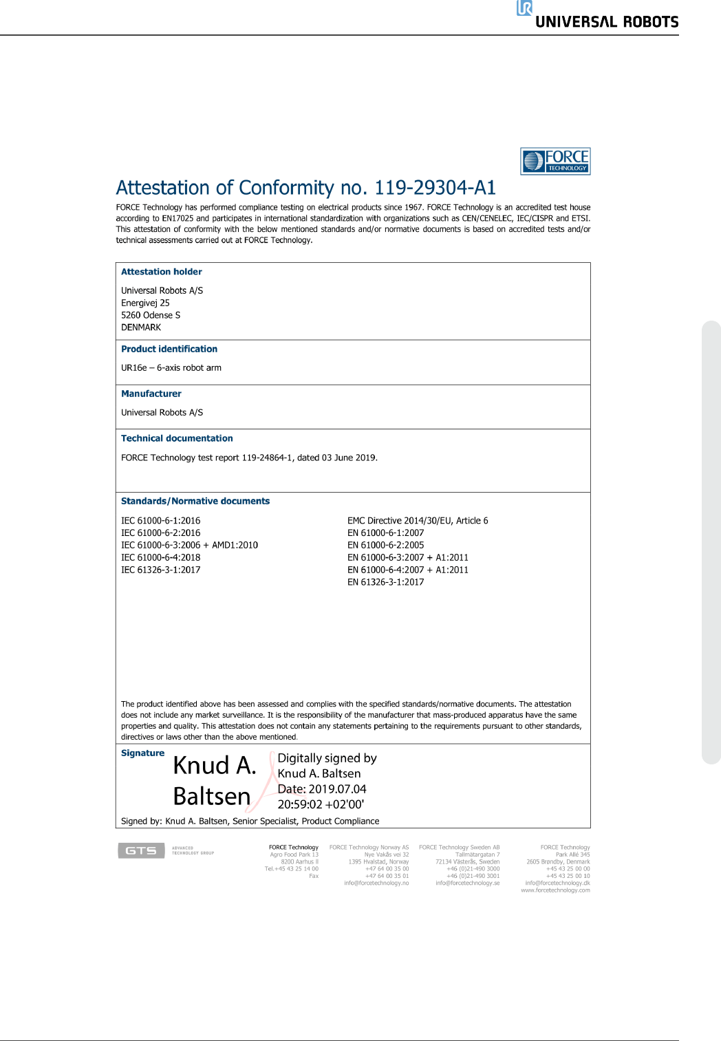 Environmental tests of UR16e, project no.: 119-24069, report no.: 119-24069-1 dated 29 April 2019