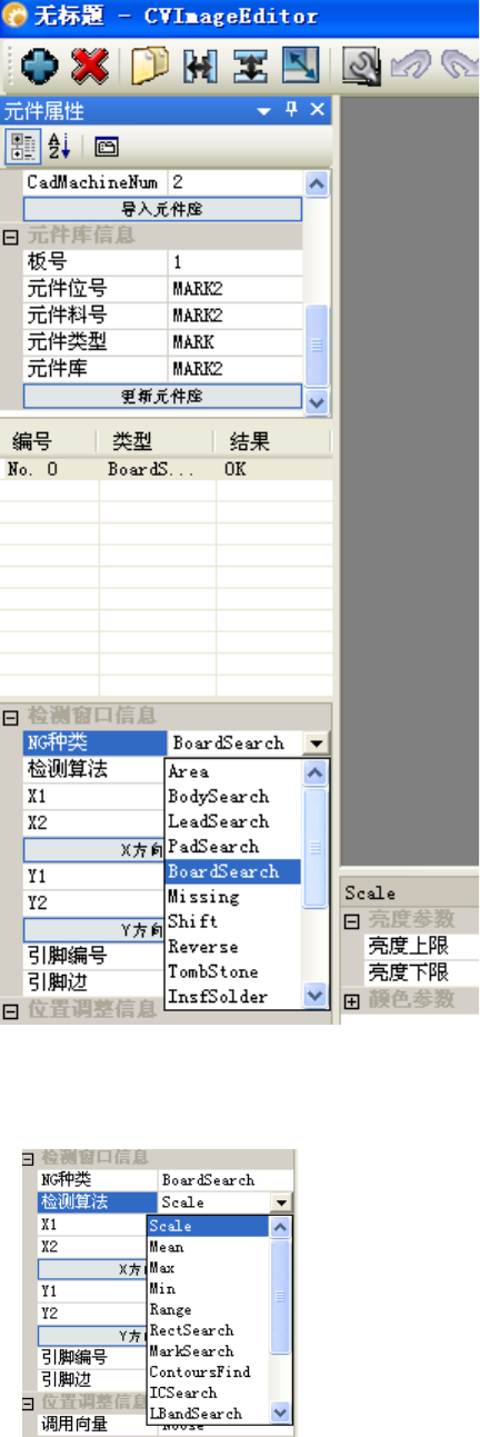 ( 8 ) 新增加一个窗口,选择相关的检查类型 ,如 mark :选 BoardSearch (注意: Area 类型系统默认不作检查) 将检查窗口调整到适当的尺寸,在图像中或是在检查窗口列表中激活 窗口,拉动检查窗口 调整尺寸 (建议 mar k 窗口尺寸大小 : 4000*4000 ) ( 9 ) 在检查窗口列表中激活需要进行选择算法的窗口,检测 算法栏 选择