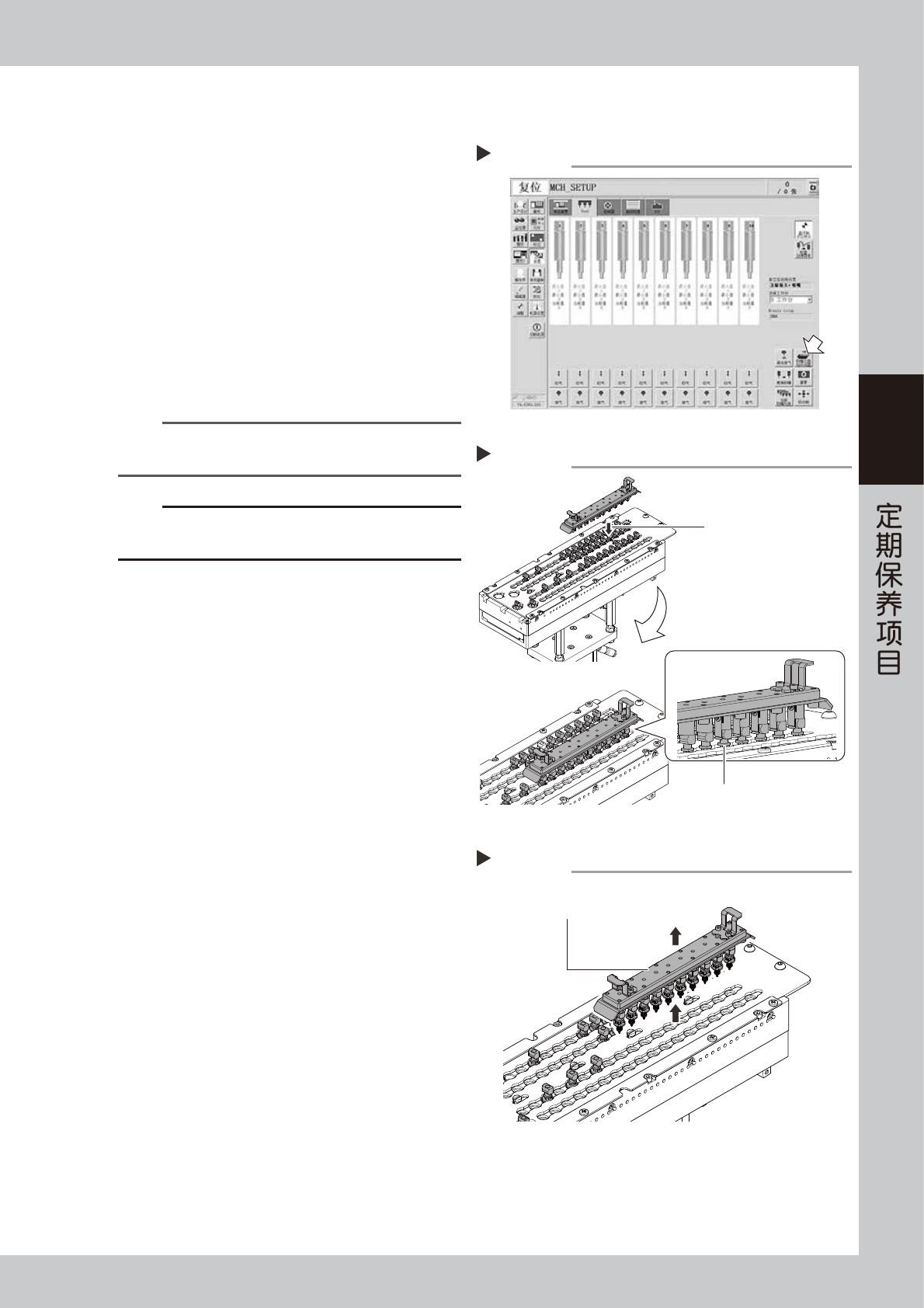 3-7 3 ■ 使用 ANC 吸嘴装卸工具拆出吸嘴的方法 下面,介绍从吸嘴交换站中拆出吸嘴的方法。 1 打开吸嘴交换站的开闭器。 打开 [ 装置 ] -“Head”画面,按 [ 吸嘴交换站开闭 器 ] 按钮,打开吸嘴交换站的开闭器。 2 e 将装卸工具安装在吸嘴交换站上。 1. 按急停按钮,打开贴片机的正面安全机盖。 2. 对准需要拆卸的吸嘴的位置,将装卸工具笔直 插入。 3. 确认装卸工具已完全套在吸嘴上了。 3 提起装卸工具。 将装…