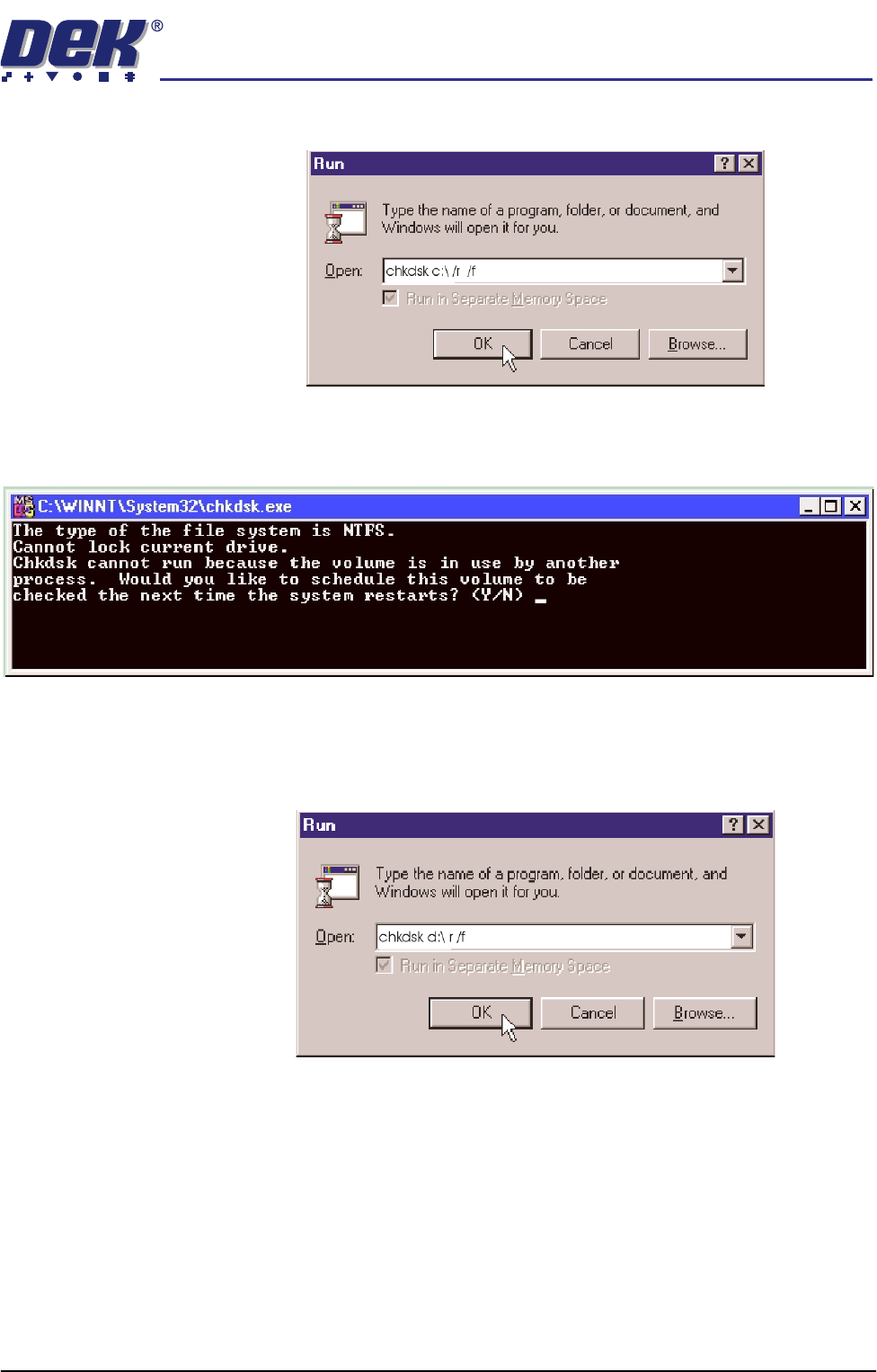 i. Click in the Open box and type chkdsk d:\ /r /f
