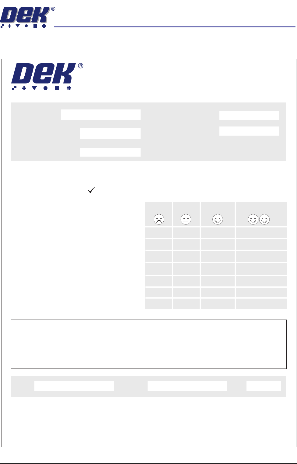 semi automatic INST ALLATION DOC UMENTATIO N DEK DELIVER Y QUESTION NAIRE Chapter Issue 1 Oct 02 Instal lation Manual 8. 1 1 DEK DELIVER Y QUESTIONNAIRE Quality Manager Customer Feedback Quality Manager +44 1305 760123 o…