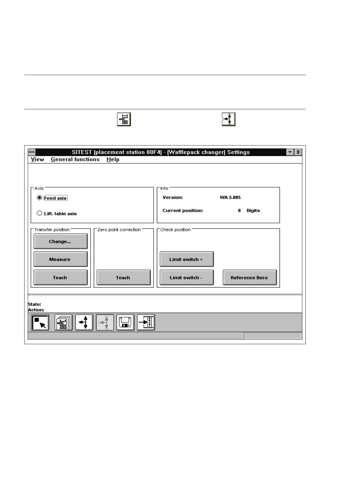 2 Functions for the Adj ustment of the Machine User’s Manual Test Program S ITEST 2.7 Wafflepack Changer Functions Software Version 403.xx Edit ion 12/97 2 - 36 2.7.1 Wafflepack Changer Settings CAUTION ∆ ! The imp roper…