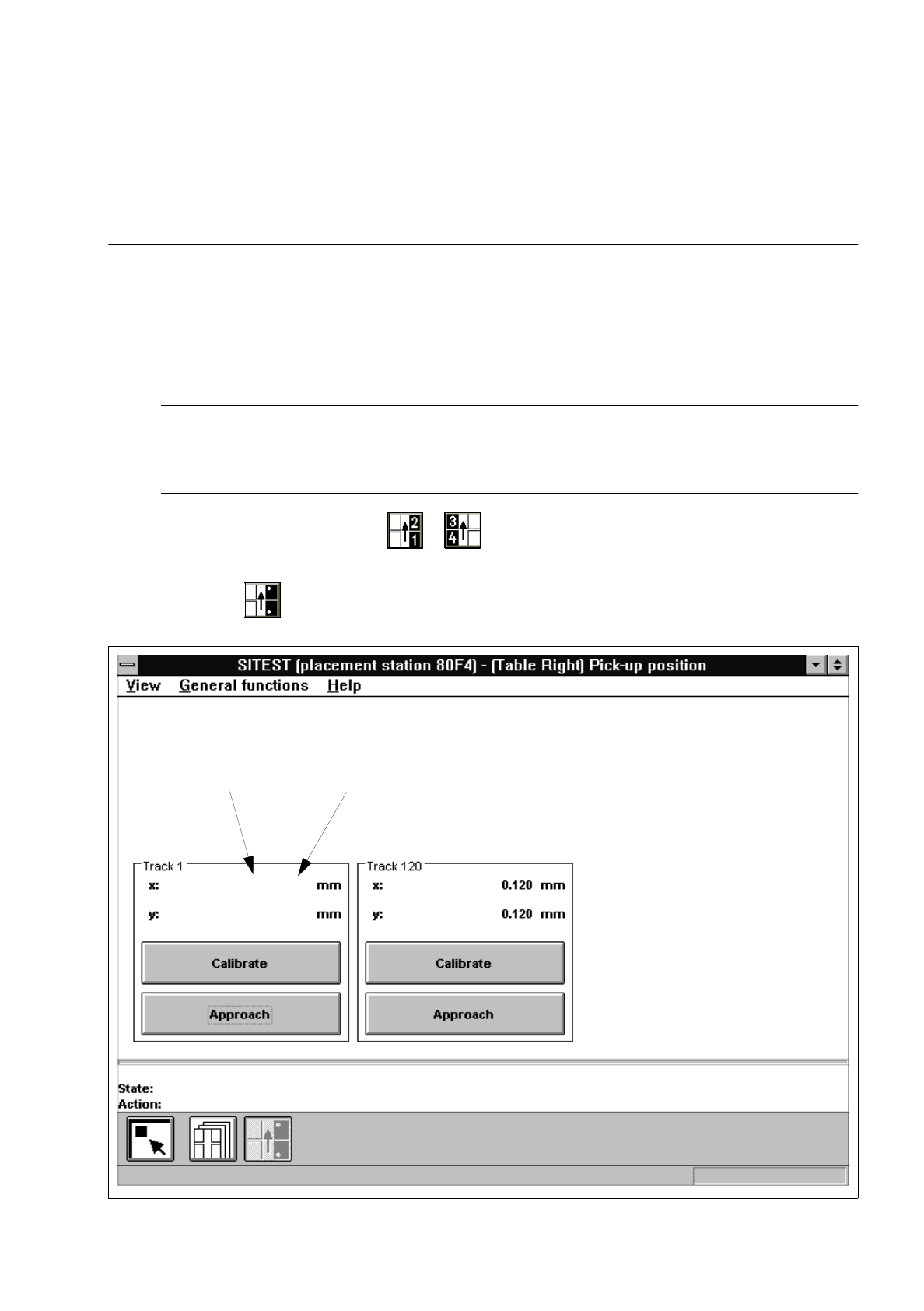 3 Calibration Functions User’s Manual Test Program S ITEST 3.13 Measuring the Pick-Up Positions of Tracks 1 and 120 Software Version 403.xx Edition 12/97 3 - 32 ● Dependin g on the po sition of the setti ng gaug e on the…