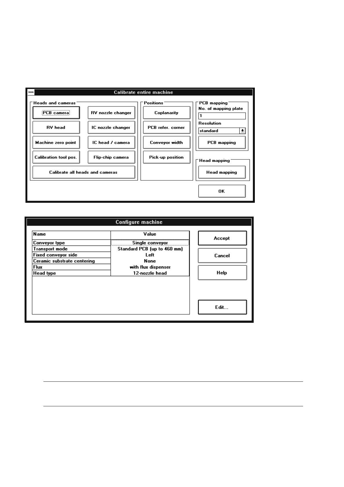 A settings box may contain, for instance, options for the setting or configuration of the machine (see examples