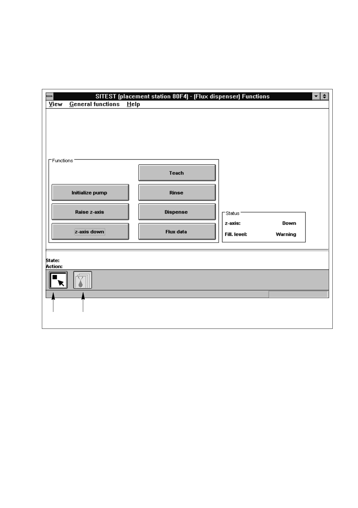 The "Flux dispenser" display contains all buttons required for testing the functions of the flux dispenser.