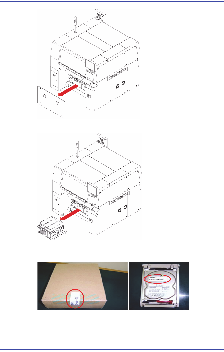 7-9 设备安装操作步骤 4. 安装 2 种卸料箱。 7.1.4.4. HDD 的安装 1. 解开设备正面下板的固定螺丝 (2 个 ) 后拆下护 盖。