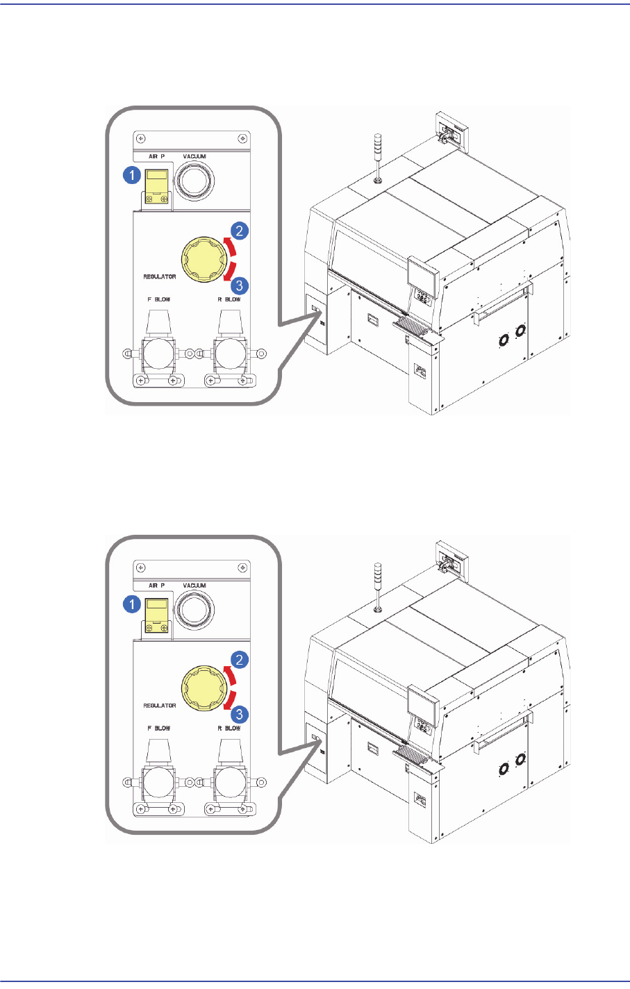 7-12 Samsung Componen t Placer SM471 Introduction 7.1.4.5. 设定气压及连接电缆 1. 在 Air Filter 的左 侧 Fitting 连接空压管。 此时, 请确认设备安装工厂内 Air Main 连 接部是否安装 Air Filter 。 1: 黄灯亮灯 2: 左侧 Fitting 2. 旋转调整器的把 手, 调节气压到 0.45~0.55 Mpa 。 (设备最大耗气量 26…