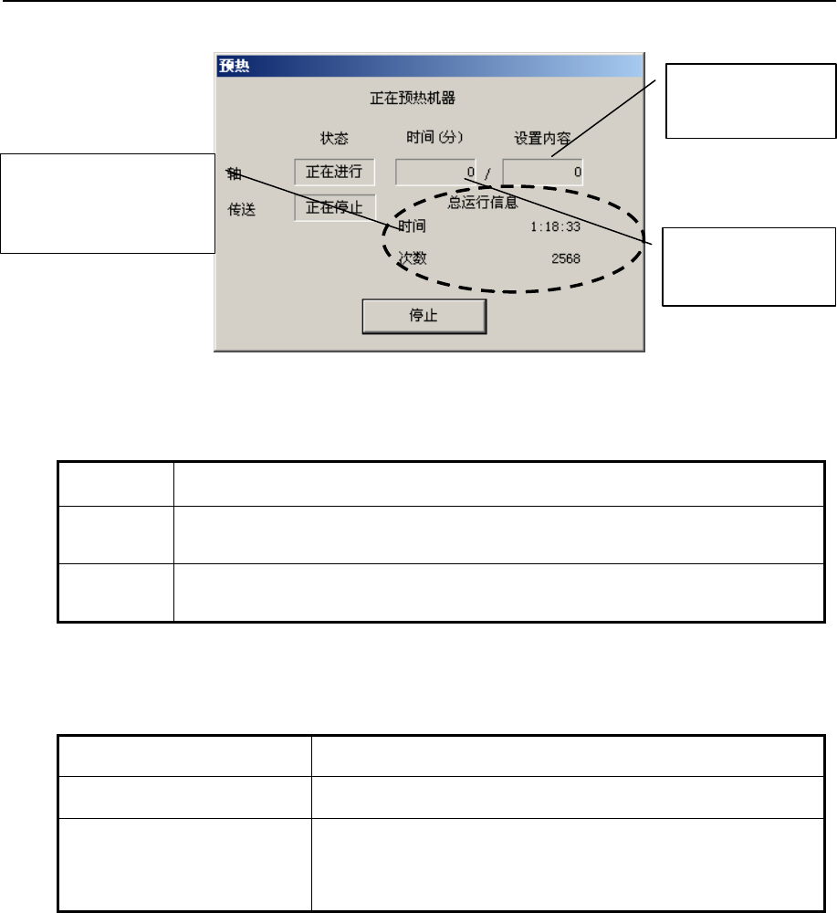 第 1 部 基本篇 第 2 章 生产 2-4-3 运行内容 预热运行期间,显示下列画面。 图 2-4-3-1 运行中的画面 选择对象后,开始执行下列预热动作 表 2-4-3-1 预热运行内容 运行对象 运 行 内 容 轴 运行 XYZ θ轴马达和 ATC 滑板。 但 ATC 滑板动作, 在反复开、 关 10 次后会自 动结束。 传送 运行传送马达、支撑台。 画面上显示如下内容 表 2-4-3- 2 进行预热时的画面 按 <STOP…